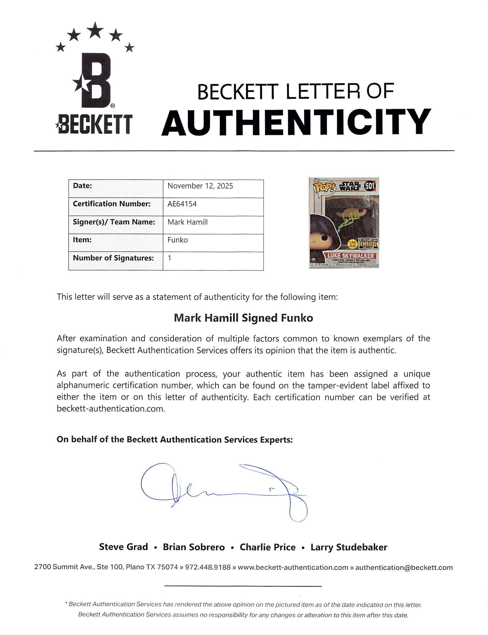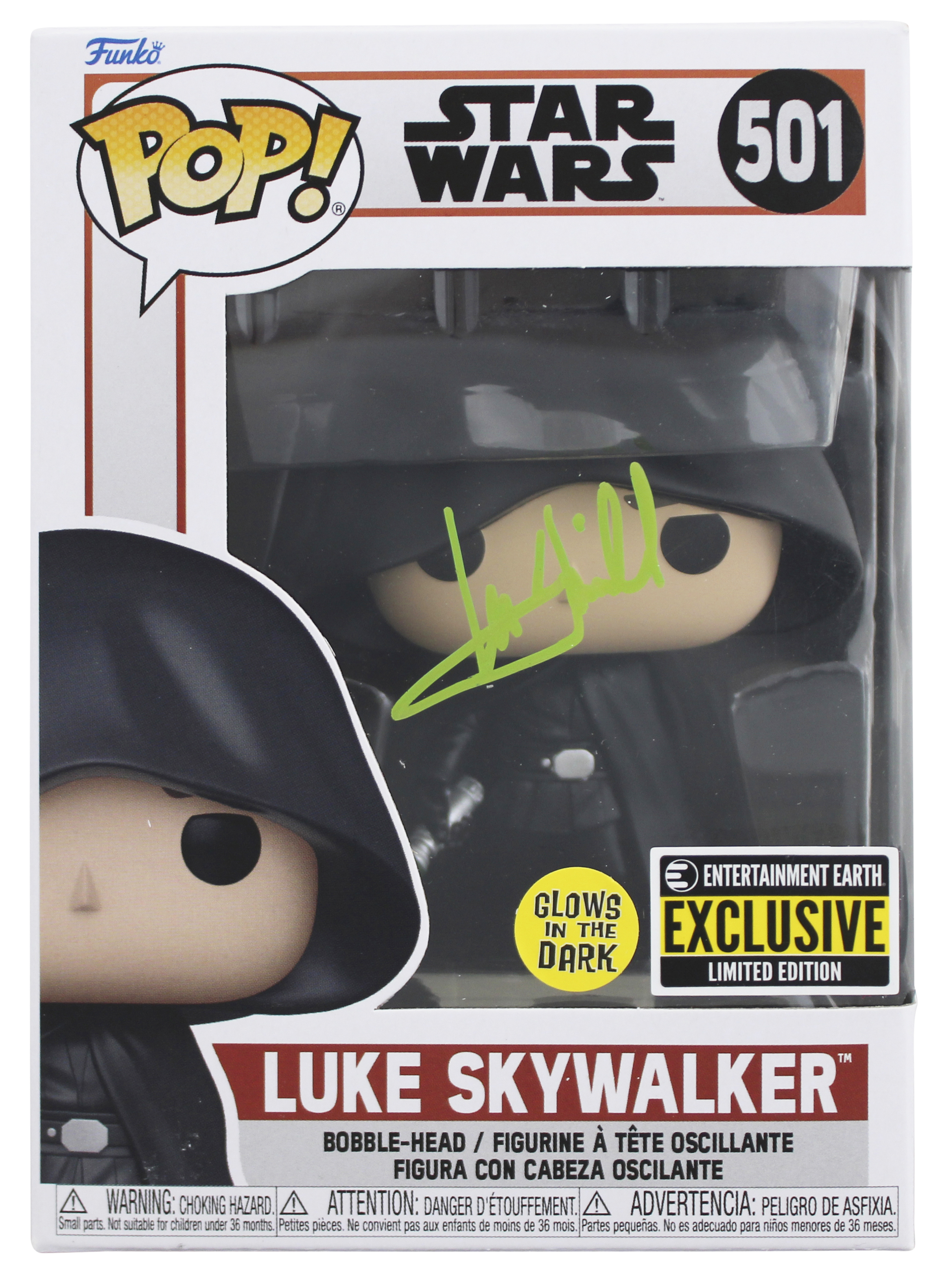 This Autographed Star Wars Luke Skywalker #501 Funko Pop Vinyl Figure has been Personally Signed by Mark Hamill of Star Wars. This item is 100% Authentic to include a Certificate of Authenticity (COA) / hologram by Beckett Authentication Services. The authenticity can be verified on Beckett Authentication Services website. This item will ship in a Pop! Protector, please refer to the photos for condition of the item prior to purchase.