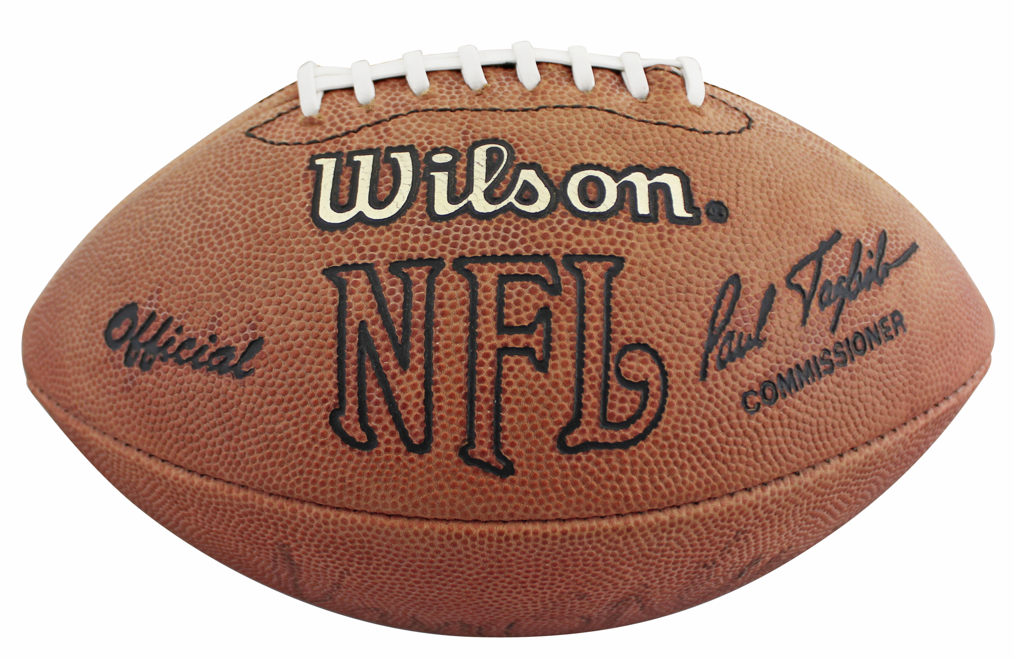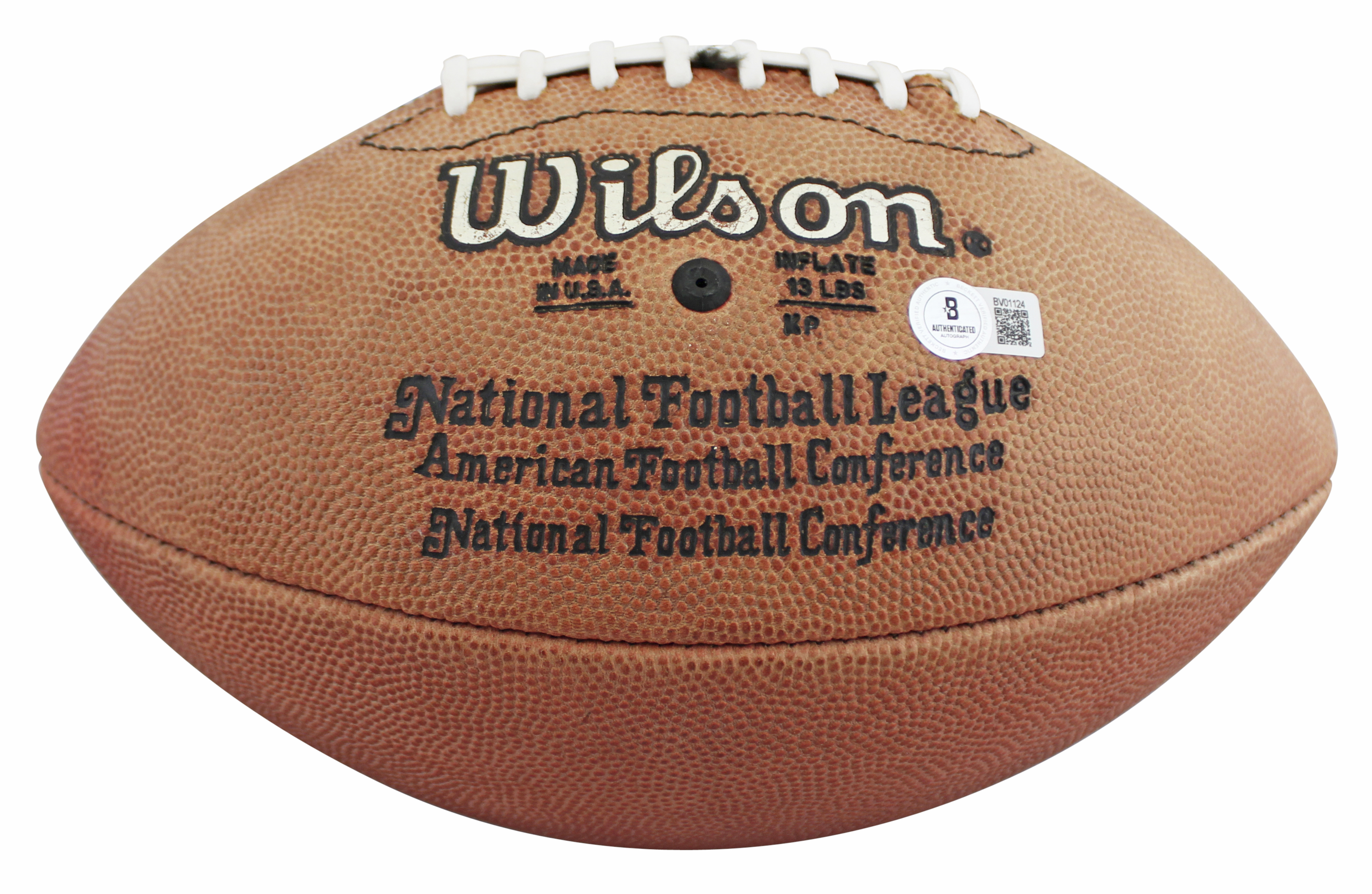 This Autographed Wilson Official Nfl Football has been Personally Signed by Marcus Allen of the Oakland Raiders. This item is 100% Authentic to include a hologram by Beckett Authentication Services. This item will come with an affixed Beckett Authentication Services (BAS) authentication sticker, which includes a scannable QR code to verify authenticity. Please note that Beckett no longer provides serial-numbered COA cards, and the attached BAS sticker will serve as the complete authentication for this item. The authenticity can be verified on Beckett Authentication Services website. The bladder on the ball is damaged, and it will not fully hold air.