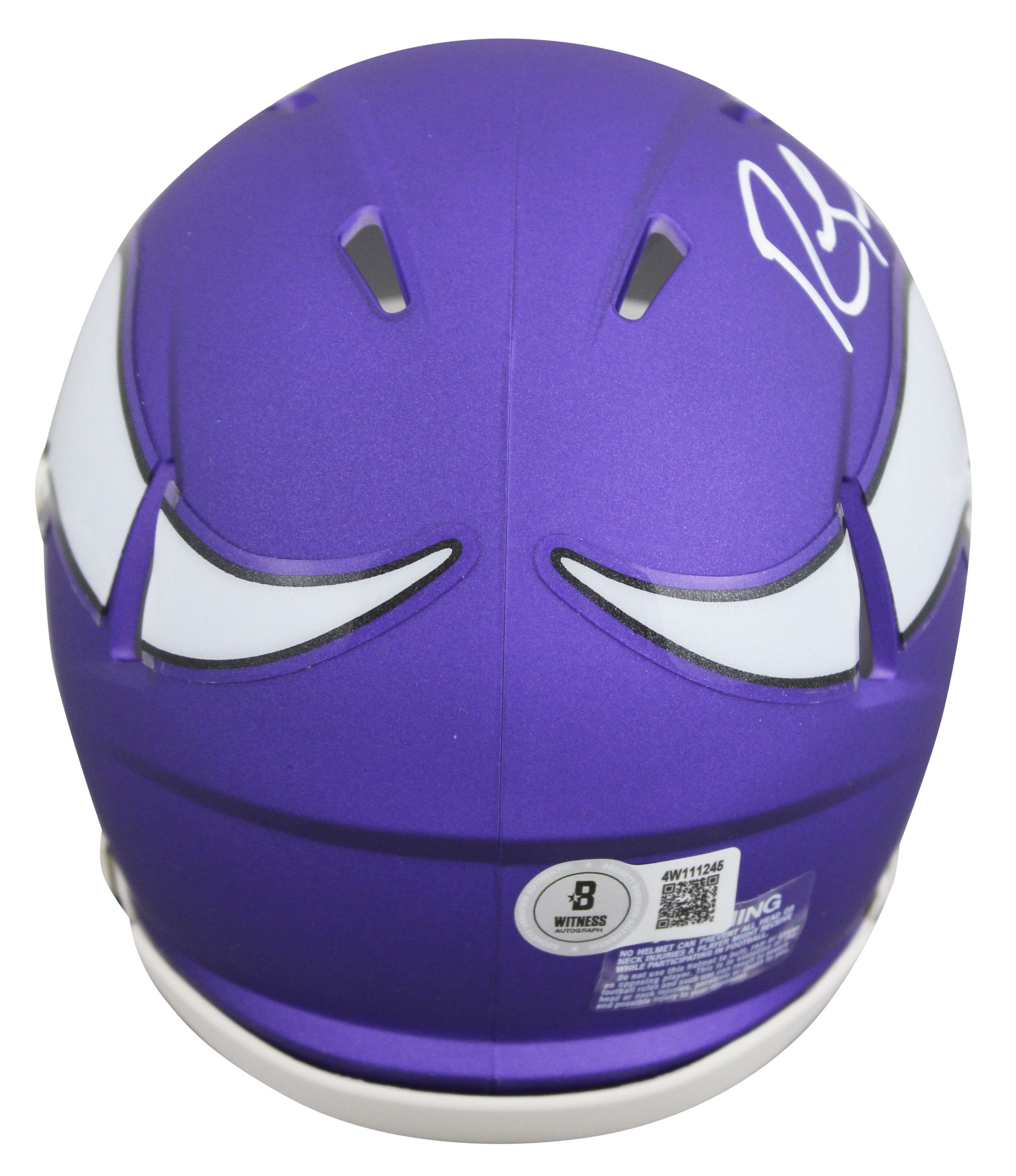 This Autographed Speed Mini Helmet has been Personally Signed by Randy Moss of the Minnesota Vikings. This item is 100% Authentic to include a hologram by Beckett Authentication Services. This item will come with an affixed Beckett Authentication Services (BAS) authentication sticker, which includes a scannable QR code to verify authenticity. Please note that Beckett no longer provides serial-numbered COA cards, and the attached BAS sticker will serve as the complete authentication for this item. This is a BAS Witnessed Protection Program item which means a Beckett Authentication Service representative was present when this item was being signed. We conducted an autograph signing with Randy Moss where multiples of the same item were signed. While the photographs are representative of this item, the size, placement and strength of the signature may vary. Each item is hand signed, therefore, each autograph is unique. This item can be verified through BAS Witnessed.