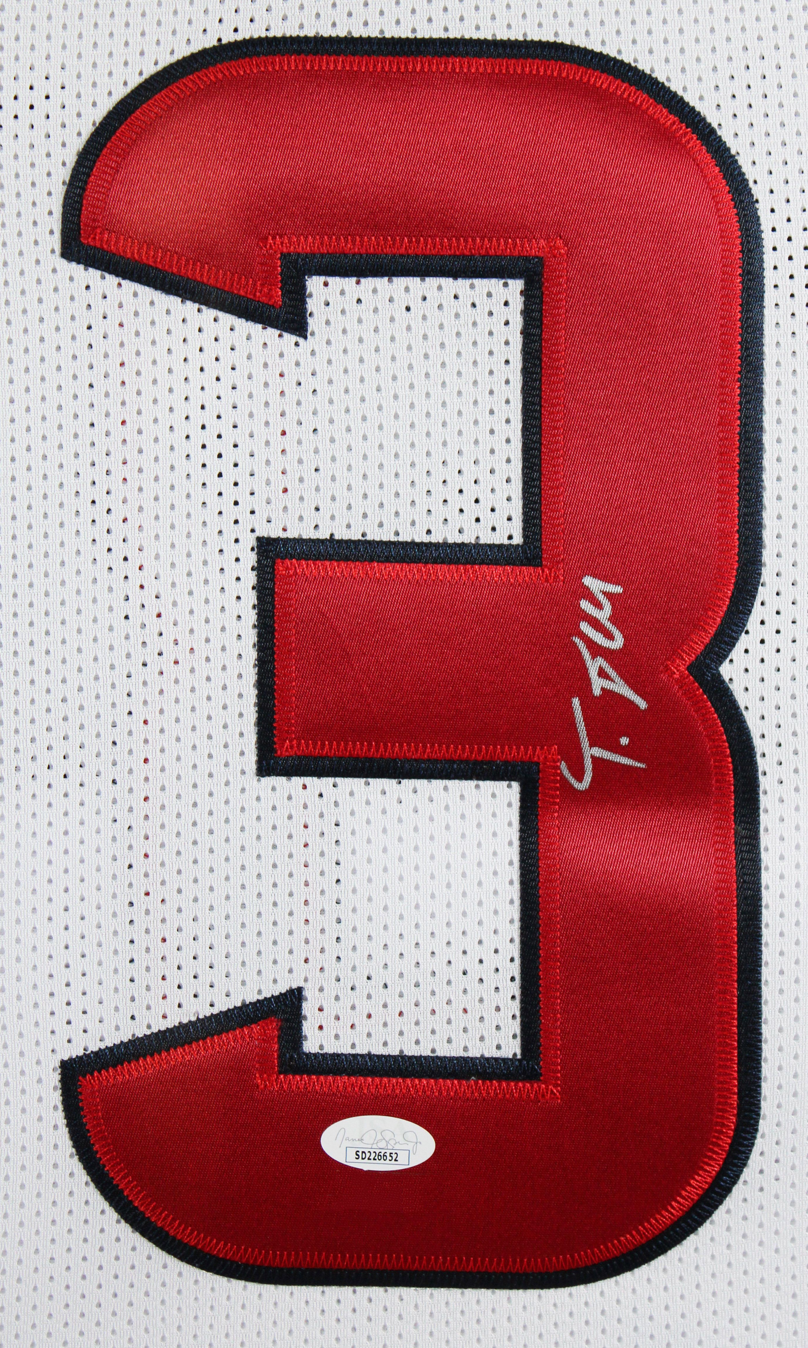 This Autographed White Pro Style Framed Jersey has been Personally Signed by Tank Dell of the Houston Texans. This item is 100% Authentic to include a hologram by Beckett Authentication Services. This item will come with an affixed Beckett Authentication Services (BAS) authentication sticker, which includes a scannable QR code to verify authenticity. Please note that Beckett no longer provides serial-numbered COA cards, and the attached BAS sticker will serve as the complete authentication for this item. This is a BAS Witnessed Protection Program item which means a Beckett Authentication Service representative was present when this item was being signed. We conducted an autograph signing with Tank Dell where multiples of the same item were signed. While the photographs are representative of this item, the size, placement and strength of the signature may vary. Each item is hand signed, therefore, each autograph is unique. This item can be verified through BAS Witnessed. This item has been professionally framed to overall dimensions of approximately 32 x 37 inches. This is a X-Large sized, non-branded, custom-stitched Framed Jersey. This jersey will be framed to order, it will take 3-4 days from purchase date for it to ship.