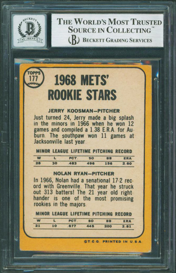 This Autographed Auto Graded Gem Mint 10! 1968 Topps #177 Rookie Card with the inscription of "324 Wins, 5,714 K's, 7 No Hitters, HOF 99" has been Personally Signed by Nolan Ryan of the New York Mets. This item is 100% Authentic, it comes slabbed and authenticated by Beckett Authentication Services. The authenticity can be verified on Beckett Authentication Services website.