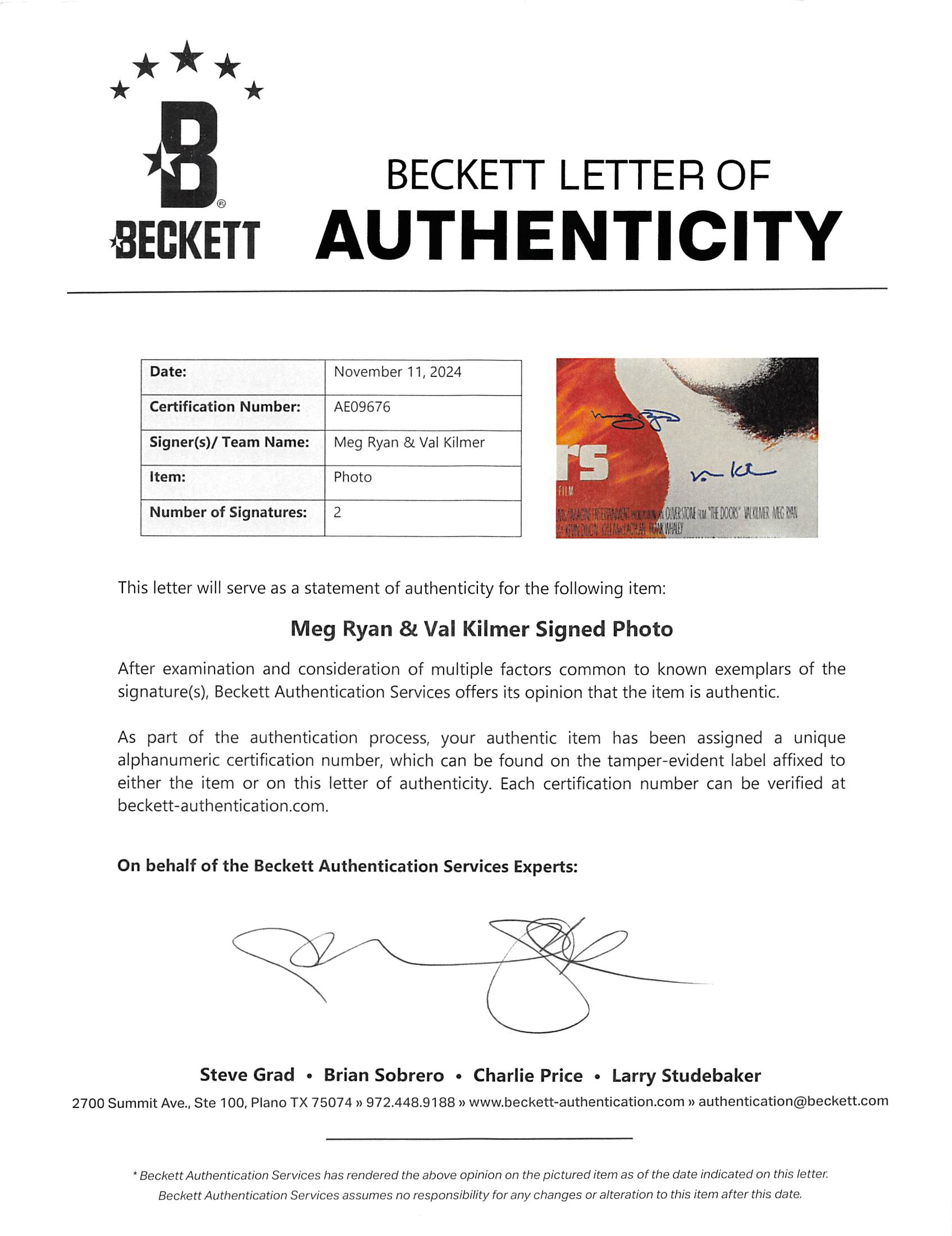 This Autographed 16x24 Framed Photo has been Personally Signed by Val Kilmer & Meg Ryan of The Doors. This item is 100% Authentic to include a Certificate of Authenticity (COA) / hologram by Beckett Authentication Services. We have multiples of this same item. While the photographs are representative of this item, the size, placement and strength of the signature may vary. Each item is hand signed, therefore, each autograph is unique. This item has been professionally framed to overall dimensions of approximately 25.5 x 33.5 inches.