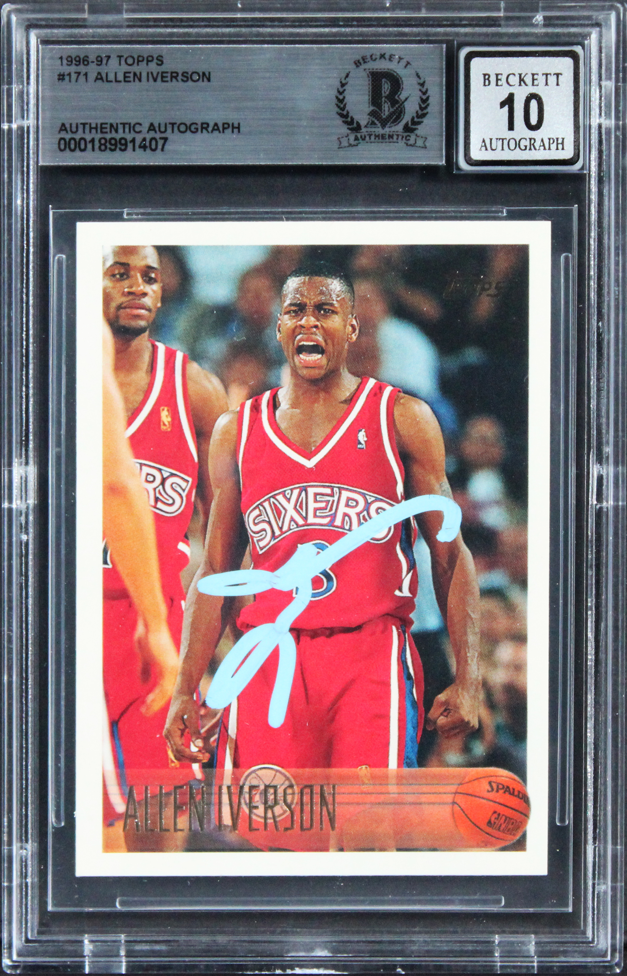 This Autographed Auto Graded Gem Mint 10! 1996 Topps #171 Rookie Card has been Personally Signed by Allen Iverson of the Philadelphia 76ers. This item is 100% Authentic, it comes slabbed and authenticated by Beckett Authentication Services. We have multiples of this same item. While the photographs are representative of this item, the size, placement and strength of the signature may vary. Each item is hand signed, therefore, each autograph is unique.