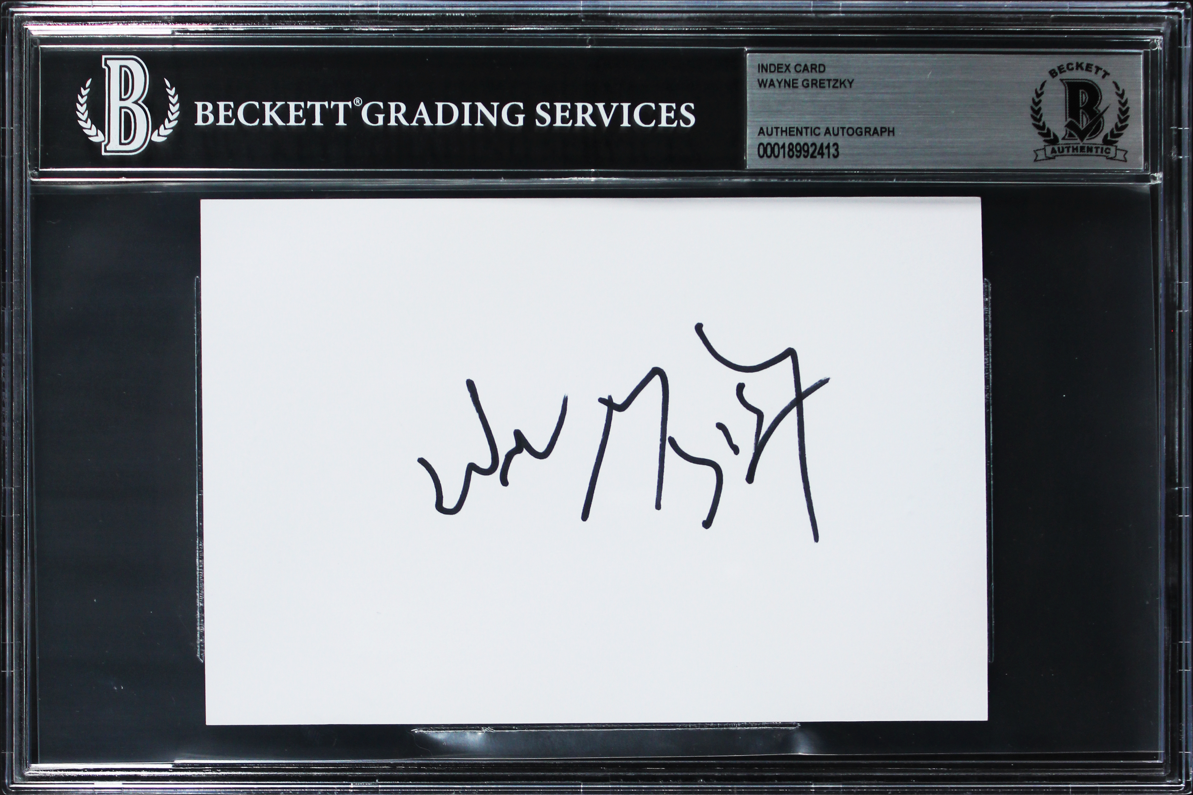 This Autographed 4x6 Index Card has been Personally Signed by Wayne Gretzky of the Edmonton Oilers. This item is 100% Authentic, it comes slabbed and authenticated by Beckett Authentication Services. The authenticity can be verified on Beckett Authentication Services website.
