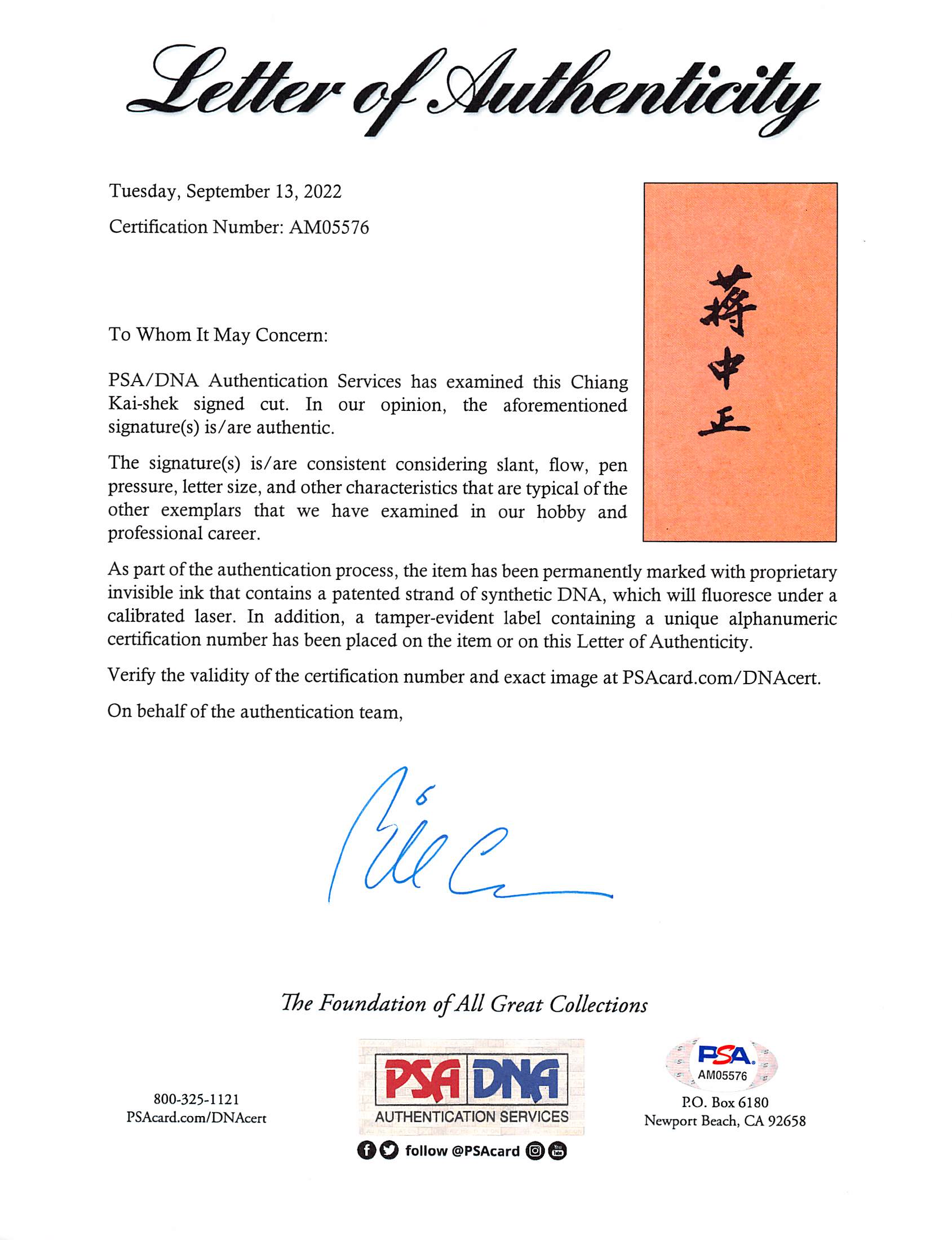 This Autographed 3x6 Cut Signature has been Personally Signed by Chiang Kai-shek. This item is 100% Authentic and comes with a PSA/DNA Certification Card and a matching numbered Hologram. The authenticity can be verified on Professional Sports Authenticator website.