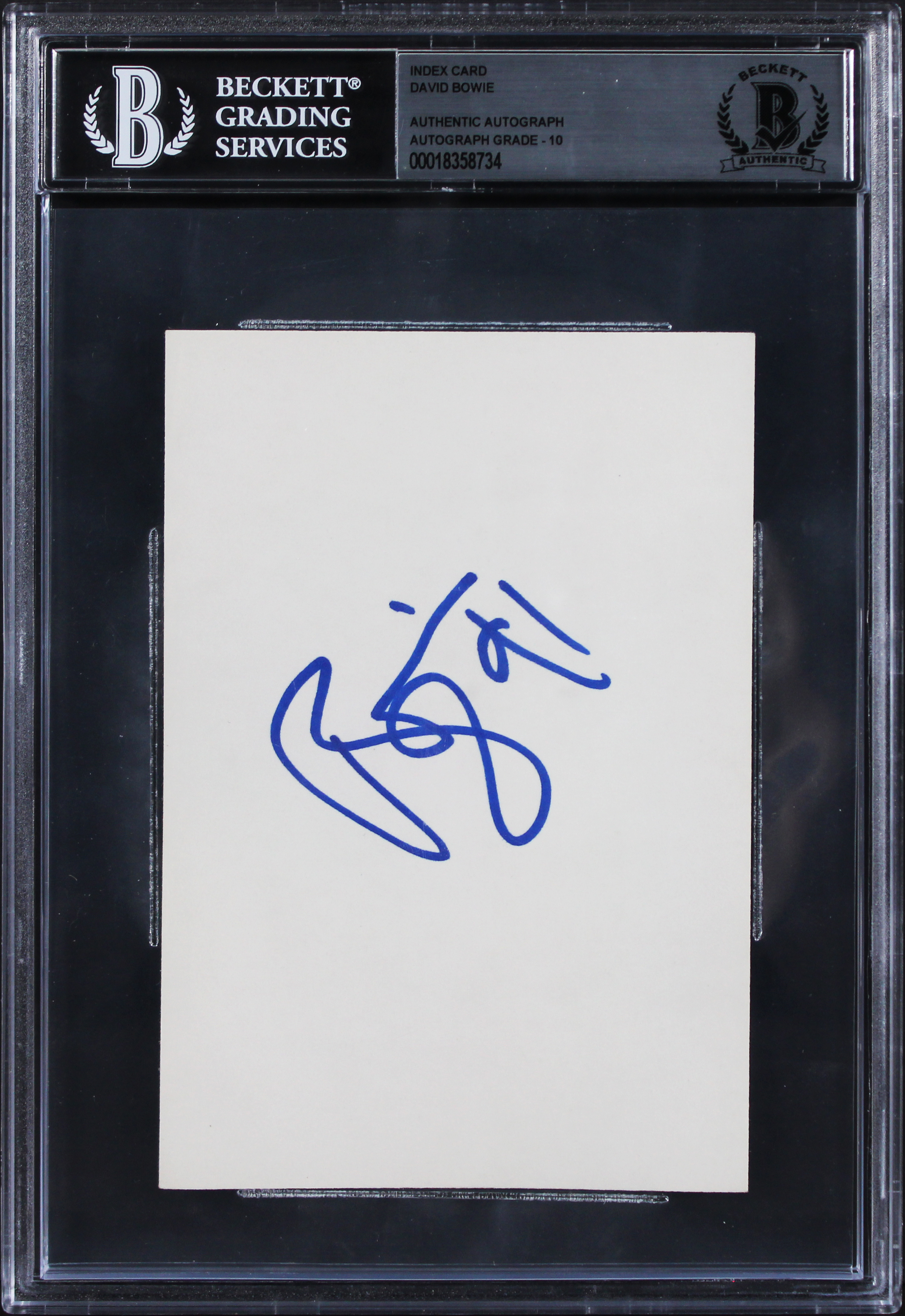 This Autographed Auto Graded Gem Mint 10! 3x5 Index Card with the inscription of "91" has been Personally Signed by David Bowie. This item is 100% Authentic, it comes slabbed and authenticated by Beckett Authentication Services. The authenticity can be verified on Beckett Authentication Services website.