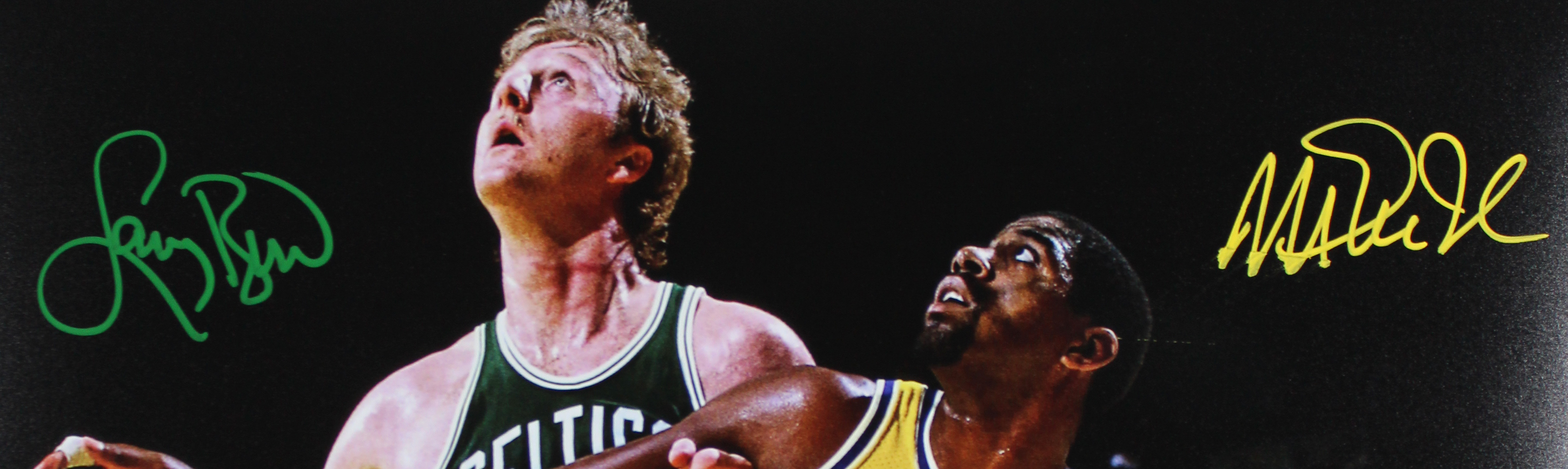 This Autographed w/ Green & Yellow Signature Vertical Boxout Spotlight 16x20 Photo has been Personally Signed by Magic Johnson & Larry Bird. This item is 100% Authentic to include a hologram by Beckett Authentication Services. This item will come with an affixed Beckett Authentication Services (BAS) authentication sticker, which includes a scannable QR code to verify authenticity. Please note that Beckett no longer provides serial-numbered COA cards, and the attached BAS sticker will serve as the complete authentication for this item. This is a BAS Witnessed Protection Program item which means a Beckett Authentication Service representative was present when this item was being signed. The authenticity can be verified on Beckett Authentication Services website.