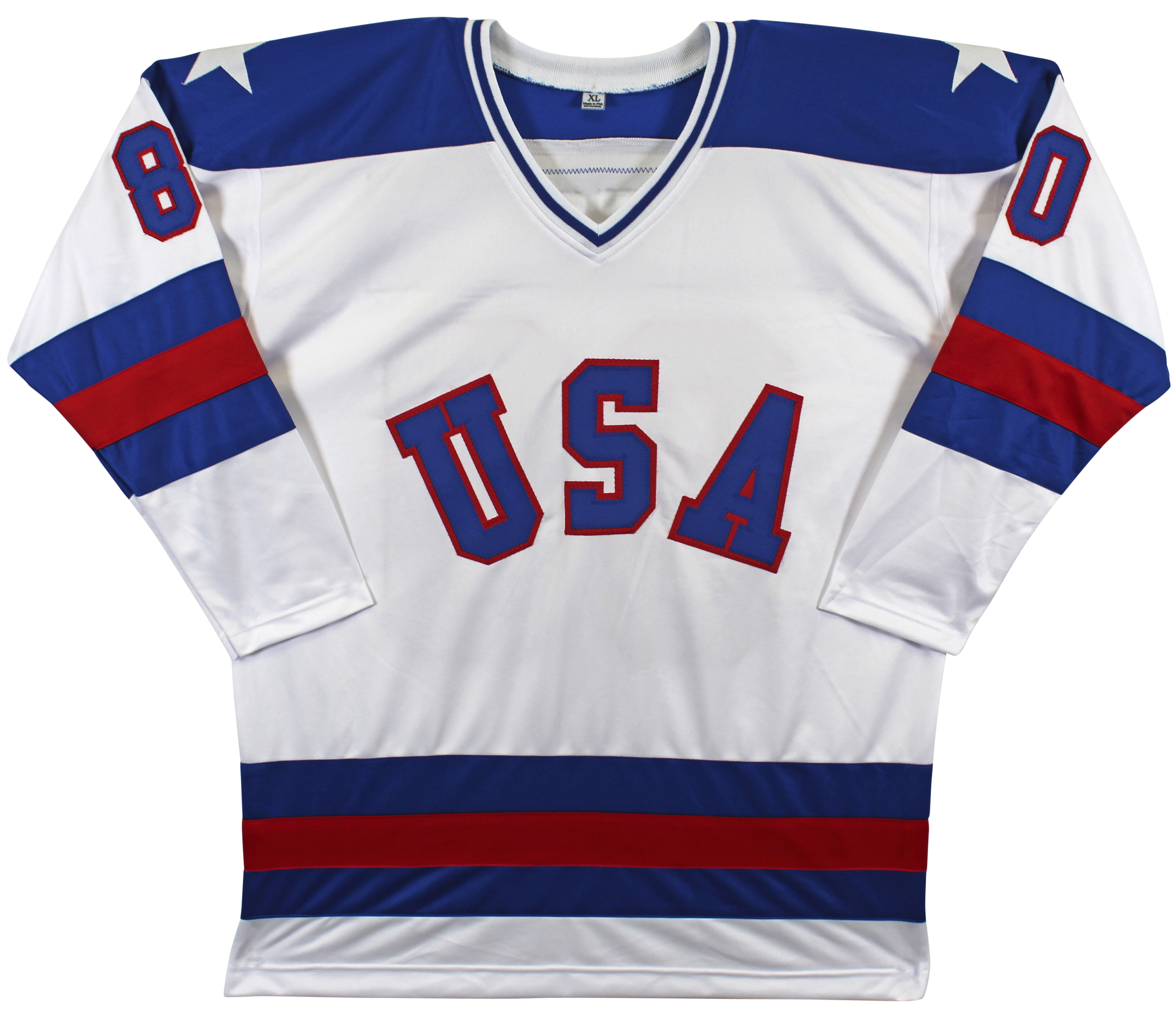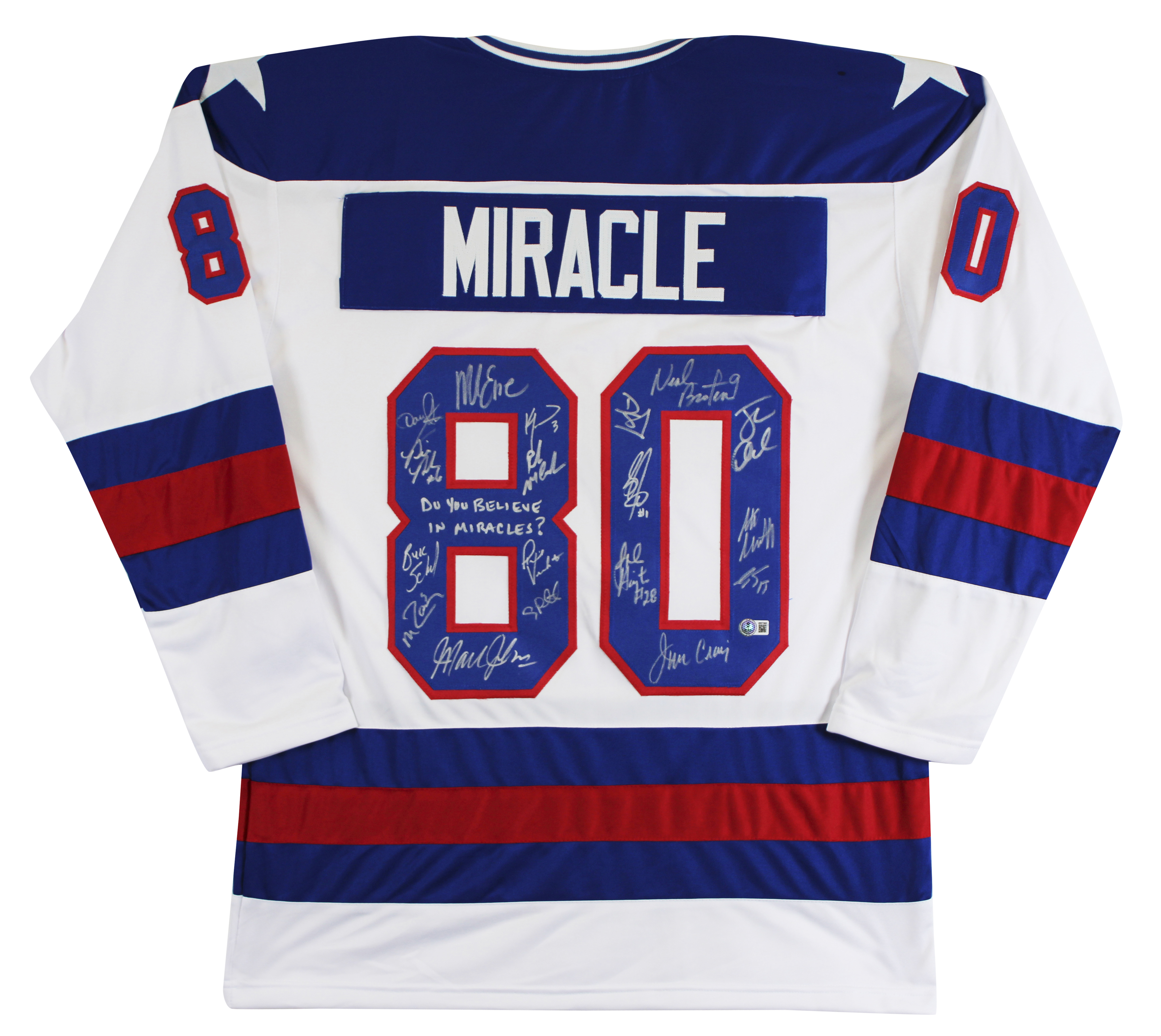 This Autographed White Pro Style Jersey with the inscription of "Do You Believe in Miracles?! (Harrington)" has been Personally Signed by Neal Broten, Dave Silk, Rob McClanahan & Mark Johnson, Steve Janaszak, Bill Baker, Dave Christian, Ken Morrow, Jack O'Callahan, Mike Ramsey, Steve Christoff, Mike Eruzione, Buzz Schneider, Eric Stroebel, Phil Verchota, Mark Wells, Craig Patrick, John Harrington & Jim Craig. This item is 100% Authentic to include a hologram by Beckett Authentication Services. This item will come with an affixed Beckett Authentication Services (BAS) authentication sticker, which includes a scannable QR code to verify authenticity. Please note that Beckett no longer provides serial-numbered COA cards, and the attached BAS sticker will serve as the complete authentication for this item. This is a BAS Witnessed Protection Program item which means a Beckett Authentication Service representative was present when this item was being signed. We conducted an autograph signing with Neal Broten, Dave Silk, Rob McClanahan & Mark Johnson, Steve Janaszak, Bill Baker, Dave Christian, Ken Morrow, Jack O'Callahan, Mike Ramsey, Steve Christoff, Mike Eruzione, Buzz Schneider, Eric Stroebel, Phil Verchota, Mark Wells, Craig Patrick, John Harrington & Jim Craig where multiples of the same item were signed. While the photographs are representative of this item, the size, placement and strength of the signature may vary. Each item is hand signed, therefore, each autograph is unique. This item can be verified through BAS Witnessed. This is a X-Large sized, non-branded, custom-stitched Jersey.