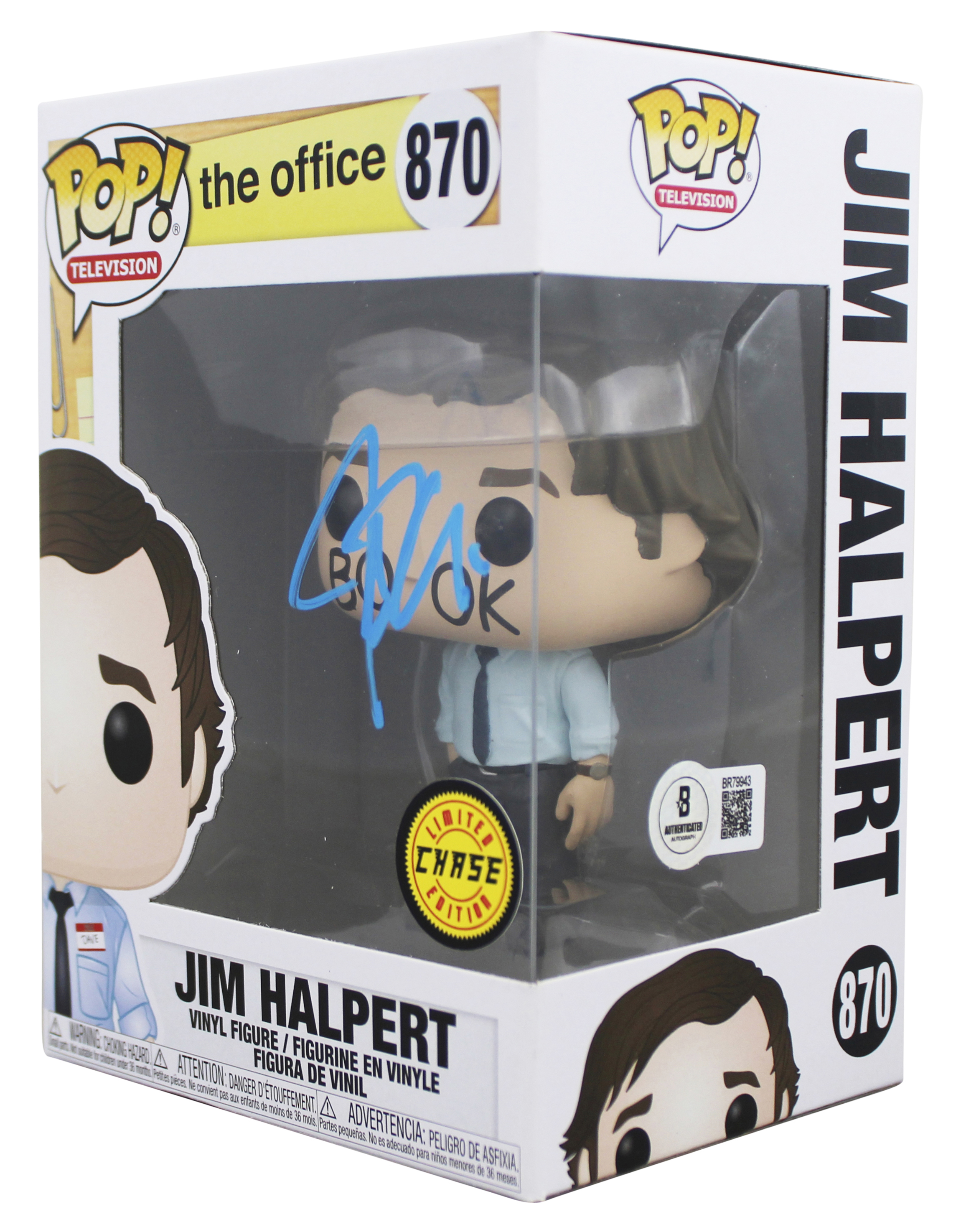 This Autographed w/ Blue Signature #870 Jim Halpert Funko Pop Vinyl Figure has been Personally Signed by John Krasinski of The Office. This item is 100% Authentic to include a hologram by Beckett Authentication Services. This item will come with an affixed Beckett Authentication Services (BAS) authentication sticker, which includes a scannable QR code to verify authenticity. Please note that Beckett no longer provides serial-numbered COA cards, and the attached BAS sticker will serve as the complete authentication for this item. We have multiples of this same item. While the photographs are representative of this item, the size, placement and strength of the signature may vary. Each item is hand signed, therefore, each autograph is unique. This item will ship in a Pop! Protector, please refer to the photos for condition of the item prior to purchase, these are in good condition but would not be considered mint.