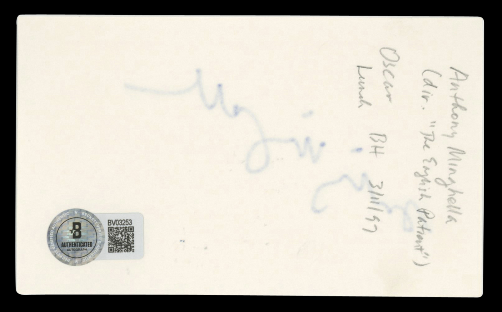 This Autographed 3x5 Index Card has been Personally Signed by Anthony Minghella. This item is 100% Authentic to include a hologram by Beckett Authentication Services. This item will come with an affixed Beckett Authentication Services (BAS) authentication sticker, which includes a scannable QR code to verify authenticity. Please note that Beckett no longer provides serial-numbered COA cards, and the attached BAS sticker will serve as the complete authentication for this item. The authenticity can be verified on Beckett Authentication Services website.