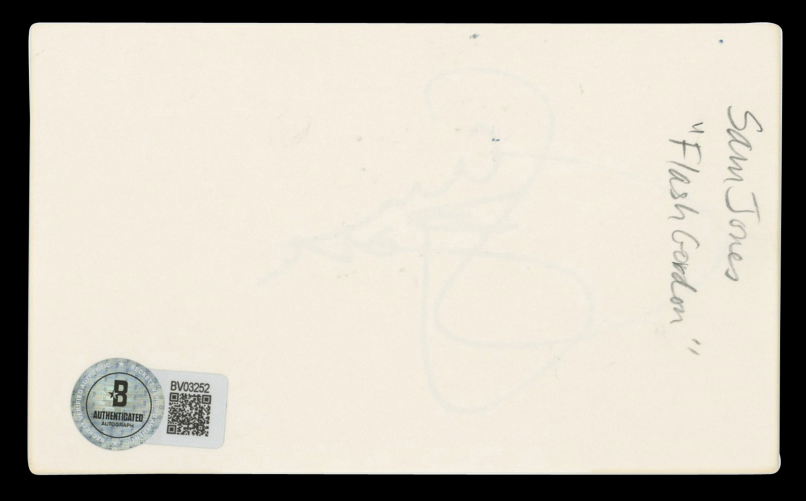 This Autographed 3x5 Index Card has been Personally Signed by Sam J. Jones of Flash Gordon. This item is 100% Authentic to include a hologram by Beckett Authentication Services. This item will come with an affixed Beckett Authentication Services (BAS) authentication sticker, which includes a scannable QR code to verify authenticity. Please note that Beckett no longer provides serial-numbered COA cards, and the attached BAS sticker will serve as the complete authentication for this item. The authenticity can be verified on Beckett Authentication Services website.