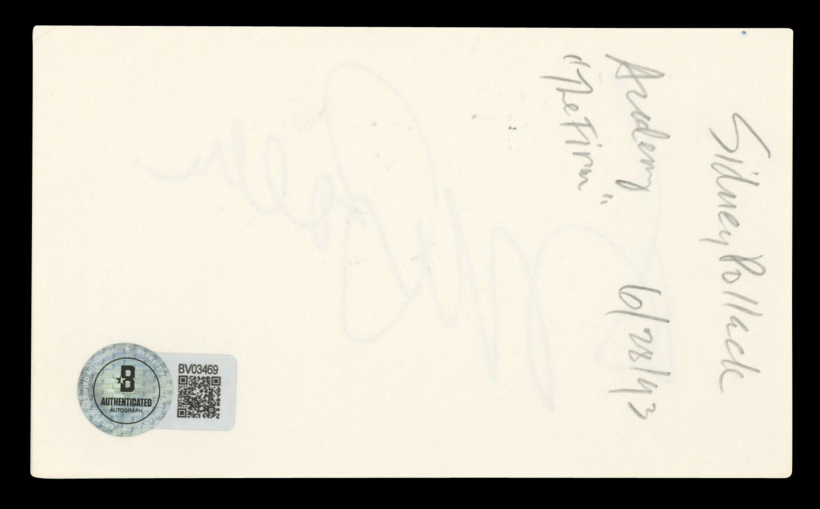 This Autographed 3x5 Index Card has been Personally Signed by Sydney Pollack. This item is 100% Authentic to include a hologram by Beckett Authentication Services. This item will come with an affixed Beckett Authentication Services (BAS) authentication sticker, which includes a scannable QR code to verify authenticity. Please note that Beckett no longer provides serial-numbered COA cards, and the attached BAS sticker will serve as the complete authentication for this item. The authenticity can be verified on Beckett Authentication Services website.