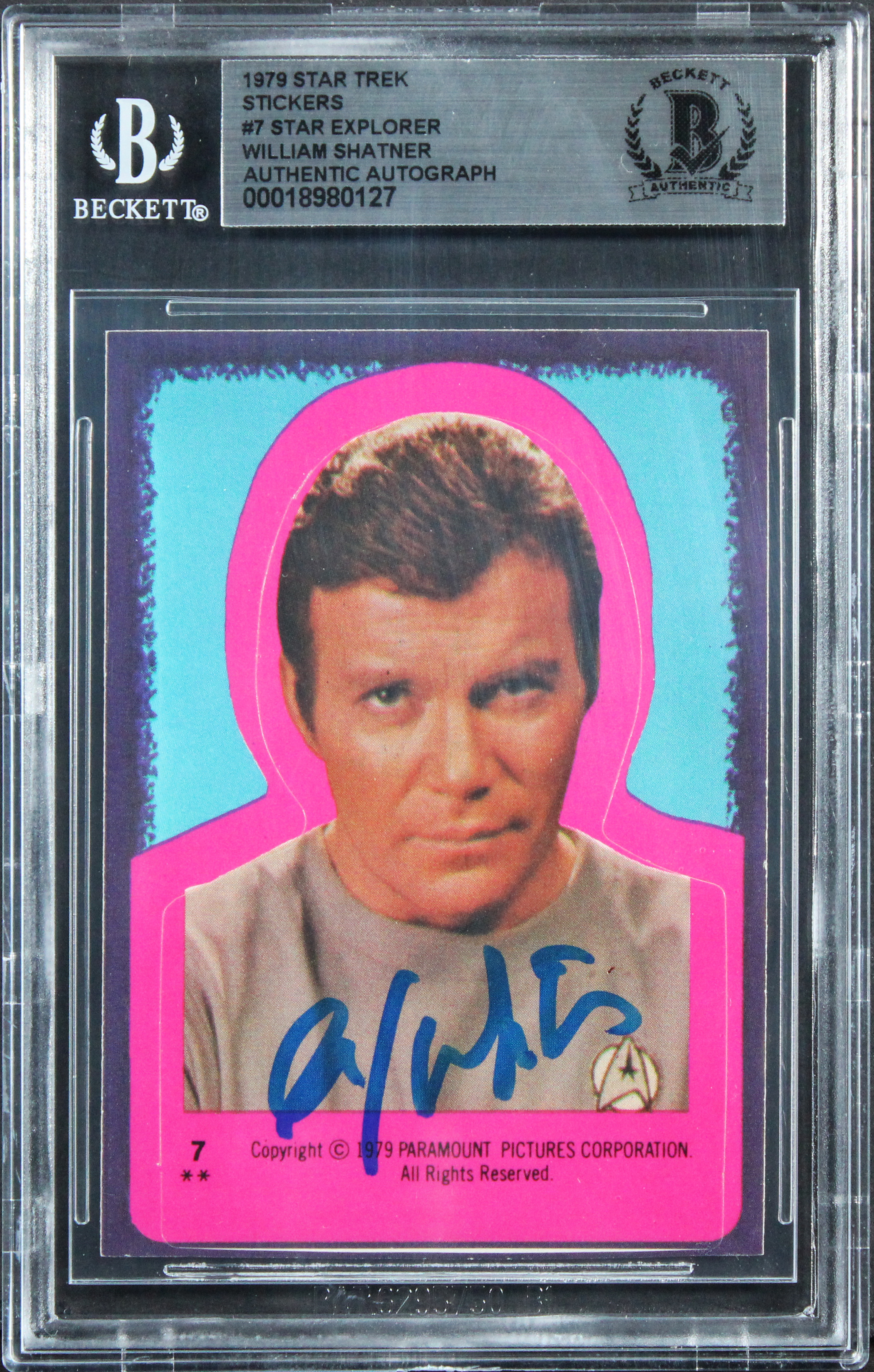 This Autographed 1979 Star Trek Stickers #7 Star Explorer Card has been Personally Signed by William Shatner of Star Trek. This item is 100% Authentic, it comes slabbed and authenticated by Beckett Authentication Services. The authenticity can be verified on Beckett Authentication Services website.