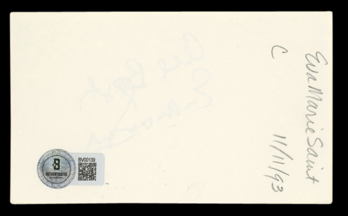 This Autographed 3x5 Index Card with the inscription of "All Best" has been Personally Signed by Eva Marie Saint of On the Waterfront. This item is 100% Authentic to include a hologram by Beckett Authentication Services. This item will come with an affixed Beckett Authentication Services (BAS) authentication sticker, which includes a scannable QR code to verify authenticity. Please note that Beckett no longer provides serial-numbered COA cards, and the attached BAS sticker will serve as the complete authentication for this item. The authenticity can be verified on Beckett Authentication Services website.