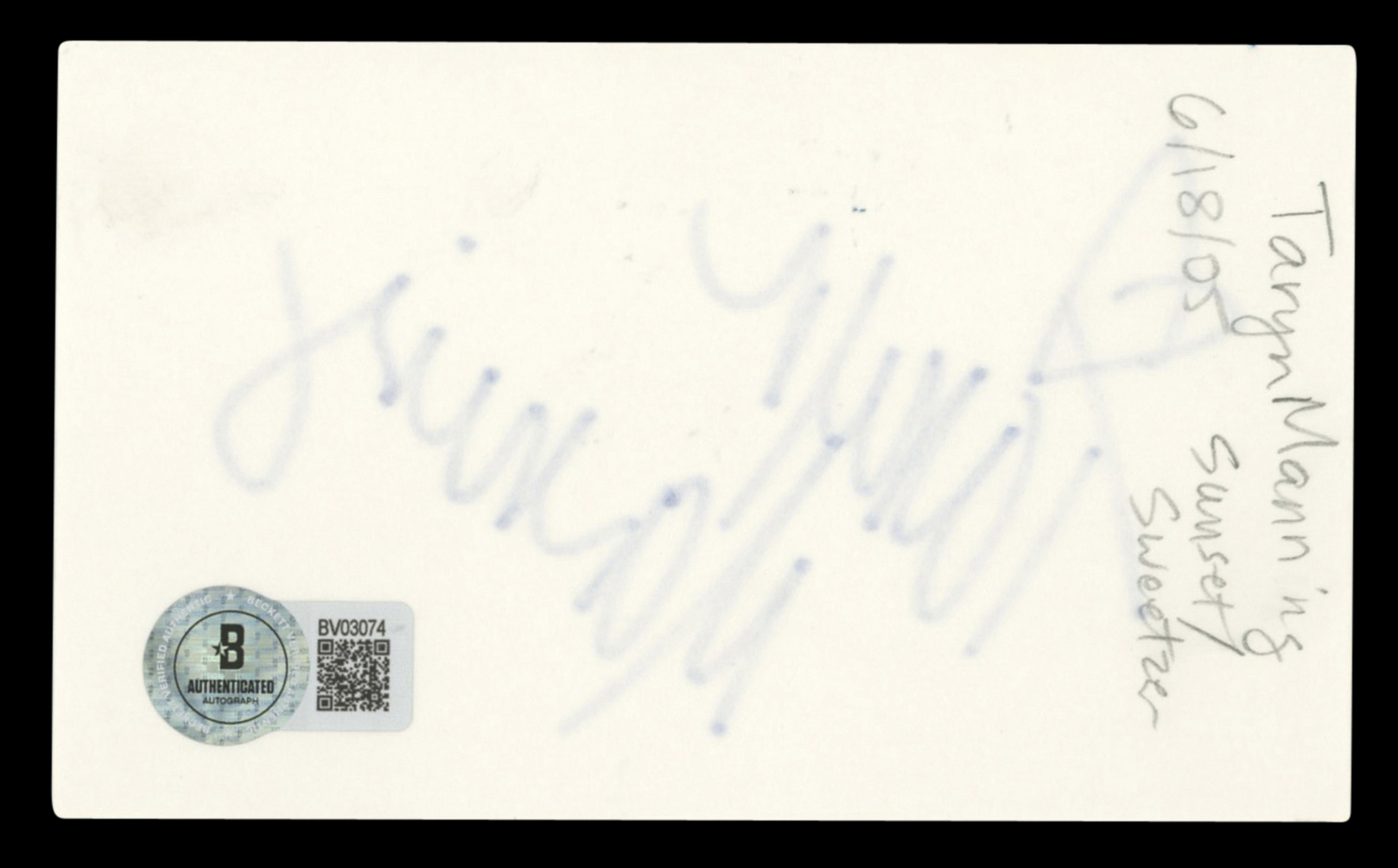 This Autographed 3x5 Index Card has been Personally Signed by Taryn Manning of Orange is the New Black. This item is 100% Authentic to include a hologram by Beckett Authentication Services. This item will come with an affixed Beckett Authentication Services (BAS) authentication sticker, which includes a scannable QR code to verify authenticity. Please note that Beckett no longer provides serial-numbered COA cards, and the attached BAS sticker will serve as the complete authentication for this item. The authenticity can be verified on Beckett Authentication Services website.