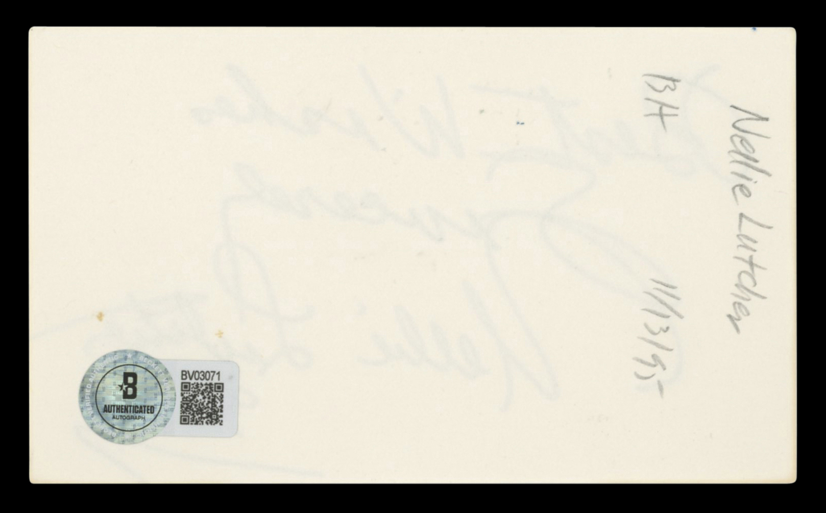 This Autographed 3x5 Index Card with the inscription of "Best Wishes Sincerely" has been Personally Signed by Nellie Lutcher. This item is 100% Authentic to include a hologram by Beckett Authentication Services. This item will come with an affixed Beckett Authentication Services (BAS) authentication sticker, which includes a scannable QR code to verify authenticity. Please note that Beckett no longer provides serial-numbered COA cards, and the attached BAS sticker will serve as the complete authentication for this item. The authenticity can be verified on Beckett Authentication Services website.