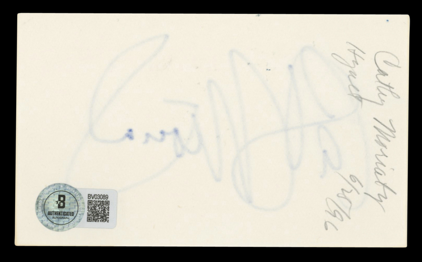 This Autographed 3x5 Index Card has been Personally Signed by Cathy Moriarty of Raging Bull. This item is 100% Authentic to include a hologram by Beckett Authentication Services. This item will come with an affixed Beckett Authentication Services (BAS) authentication sticker, which includes a scannable QR code to verify authenticity. Please note that Beckett no longer provides serial-numbered COA cards, and the attached BAS sticker will serve as the complete authentication for this item. The authenticity can be verified on Beckett Authentication Services website.