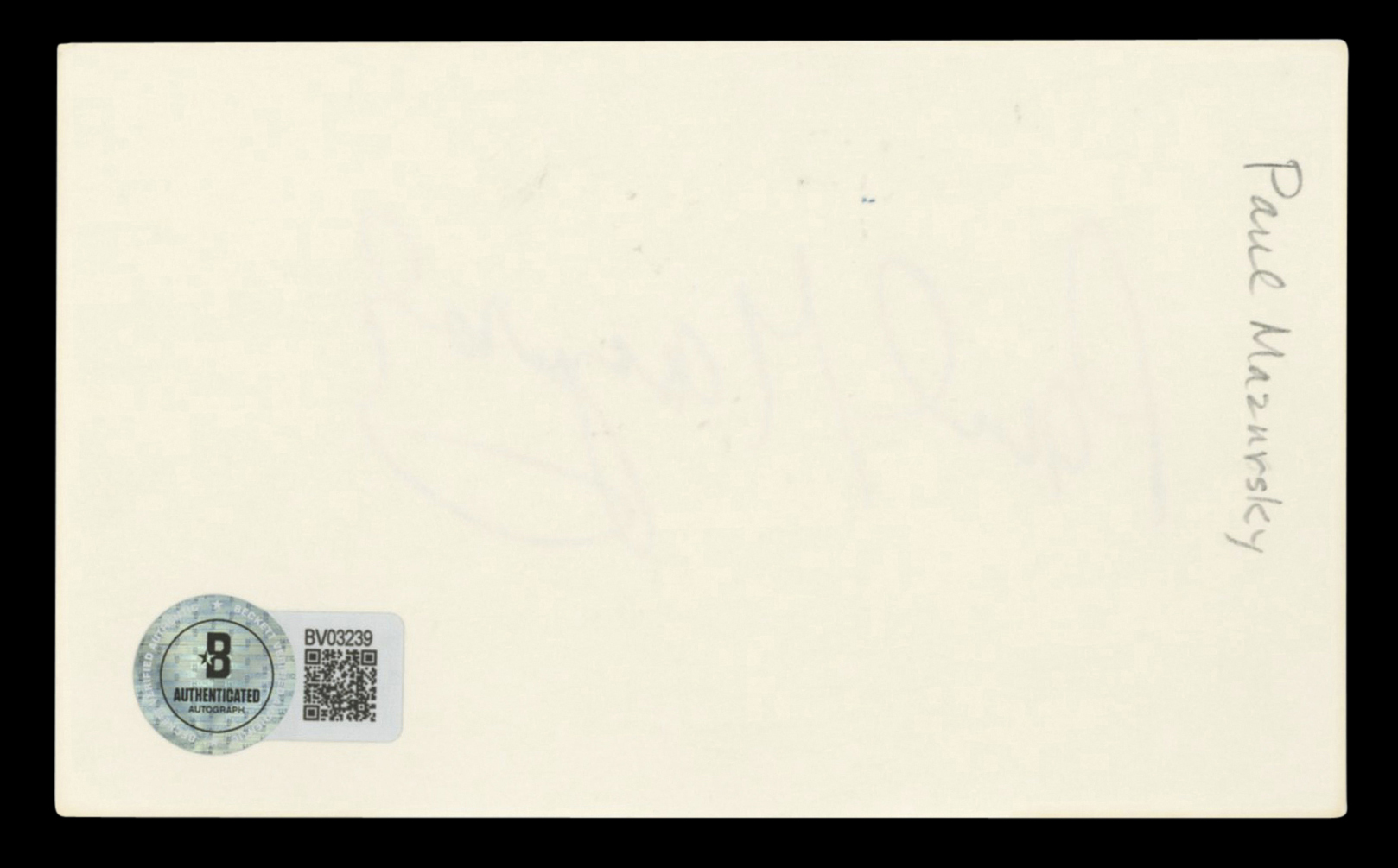 This Autographed 3x5 Index Card has been Personally Signed by Paul Mazursky. This item is 100% Authentic to include a hologram by Beckett Authentication Services. This item will come with an affixed Beckett Authentication Services (BAS) authentication sticker, which includes a scannable QR code to verify authenticity. Please note that Beckett no longer provides serial-numbered COA cards, and the attached BAS sticker will serve as the complete authentication for this item. The authenticity can be verified on Beckett Authentication Services website.