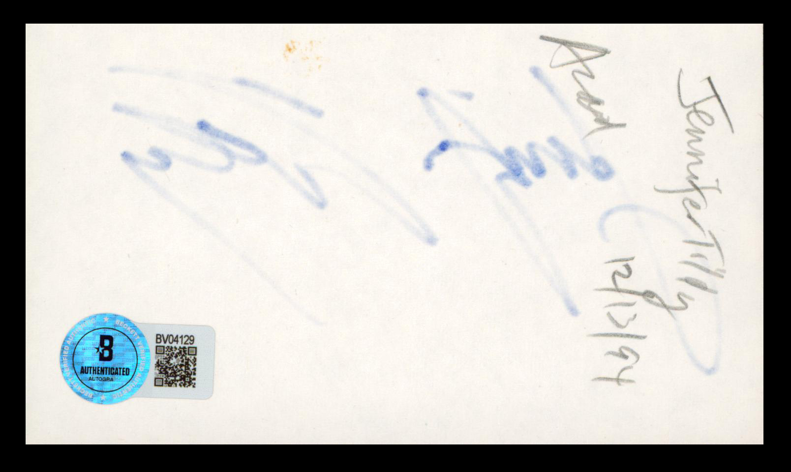 This Autographed 3x5 Index Card has been Personally Signed by Jennifer Tilly of Bride of Chucky. This item is 100% Authentic to include a hologram by Beckett Authentication Services. This item will come with an affixed Beckett Authentication Services (BAS) authentication sticker, which includes a scannable QR code to verify authenticity. Please note that Beckett no longer provides serial-numbered COA cards, and the attached BAS sticker will serve as the complete authentication for this item. We have multiples of this same item. While the photographs are representative of this item, the size, placement and strength of the signature may vary. Each item is hand signed, therefore, each autograph is unique.
