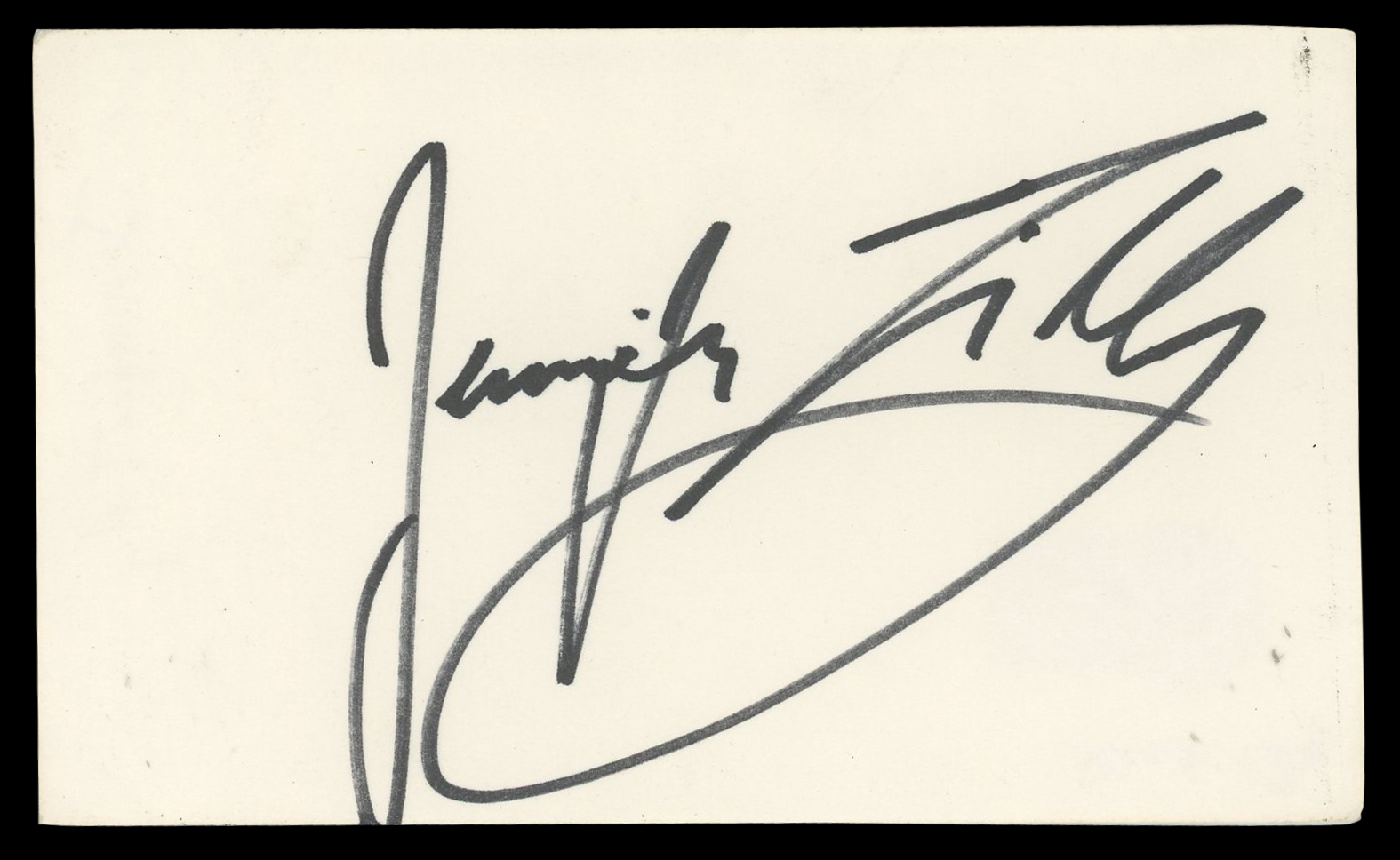 This Autographed 3x5 Index Card has been Personally Signed by Jennifer Tilly of Bride of Chucky. This item is 100% Authentic to include a hologram by Beckett Authentication Services. This item will come with an affixed Beckett Authentication Services (BAS) authentication sticker, which includes a scannable QR code to verify authenticity. Please note that Beckett no longer provides serial-numbered COA cards, and the attached BAS sticker will serve as the complete authentication for this item. We have multiples of this same item. While the photographs are representative of this item, the size, placement and strength of the signature may vary. Each item is hand signed, therefore, each autograph is unique.