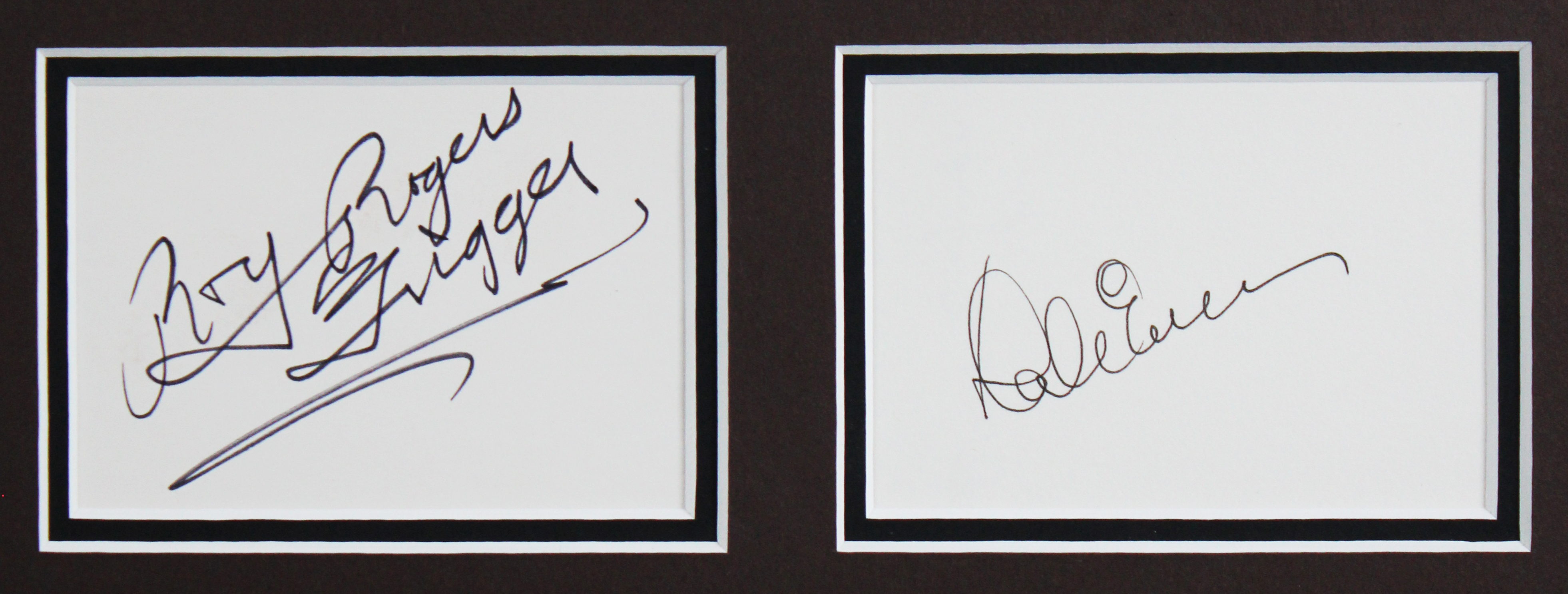 This Autographed Framed Display has been Personally Signed by Dale Evans & Roy Rogers of Hollywood Canteen. This item is 100% Authentic to include a Certificate of Authenticity (COA) / hologram by Beckett Authentication Services. We have multiples of this same item. While the photographs are representative of this item, the size, placement and strength of the signature may vary. Each item is hand signed, therefore, each autograph is unique. This item has been professionally framed to overall dimensions of approximately 21.5 x 24.5 inches.