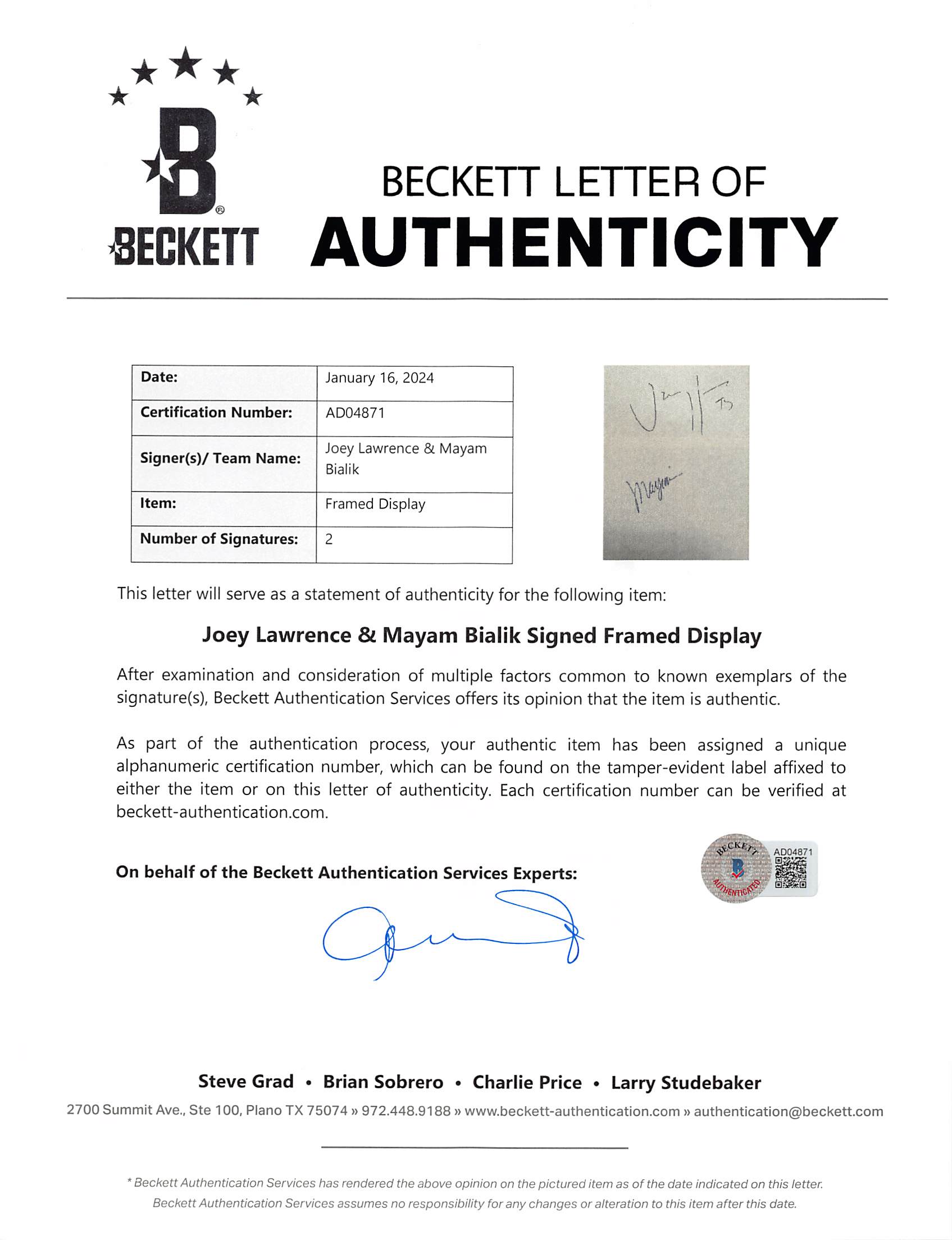 This Autographed Framed Display has been Personally Signed by Bayim Bialik & Joey Lawrence of Blossom. This item is 100% Authentic to include a Certificate of Authenticity (COA) / hologram by Beckett Authentication Services. The authenticity can be verified on Beckett Authentication Services website. This item has been professionally framed to overall dimensions of approximately 19.5 x 29.5 inches.