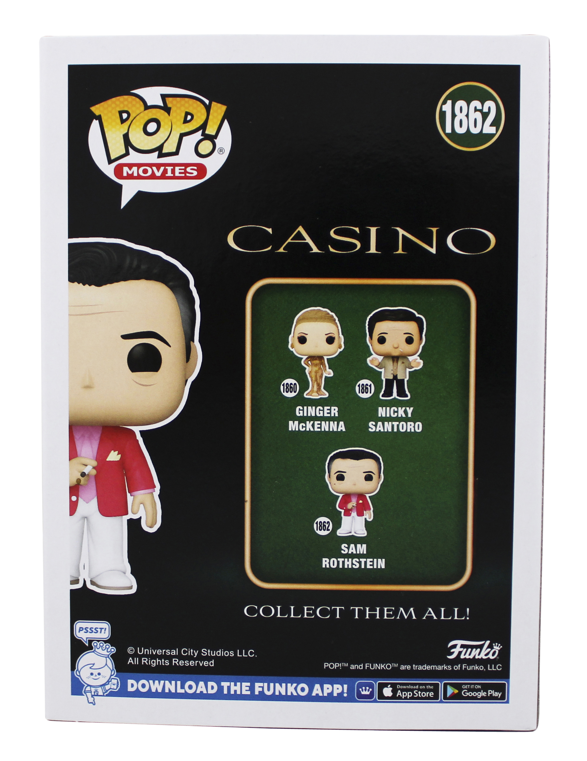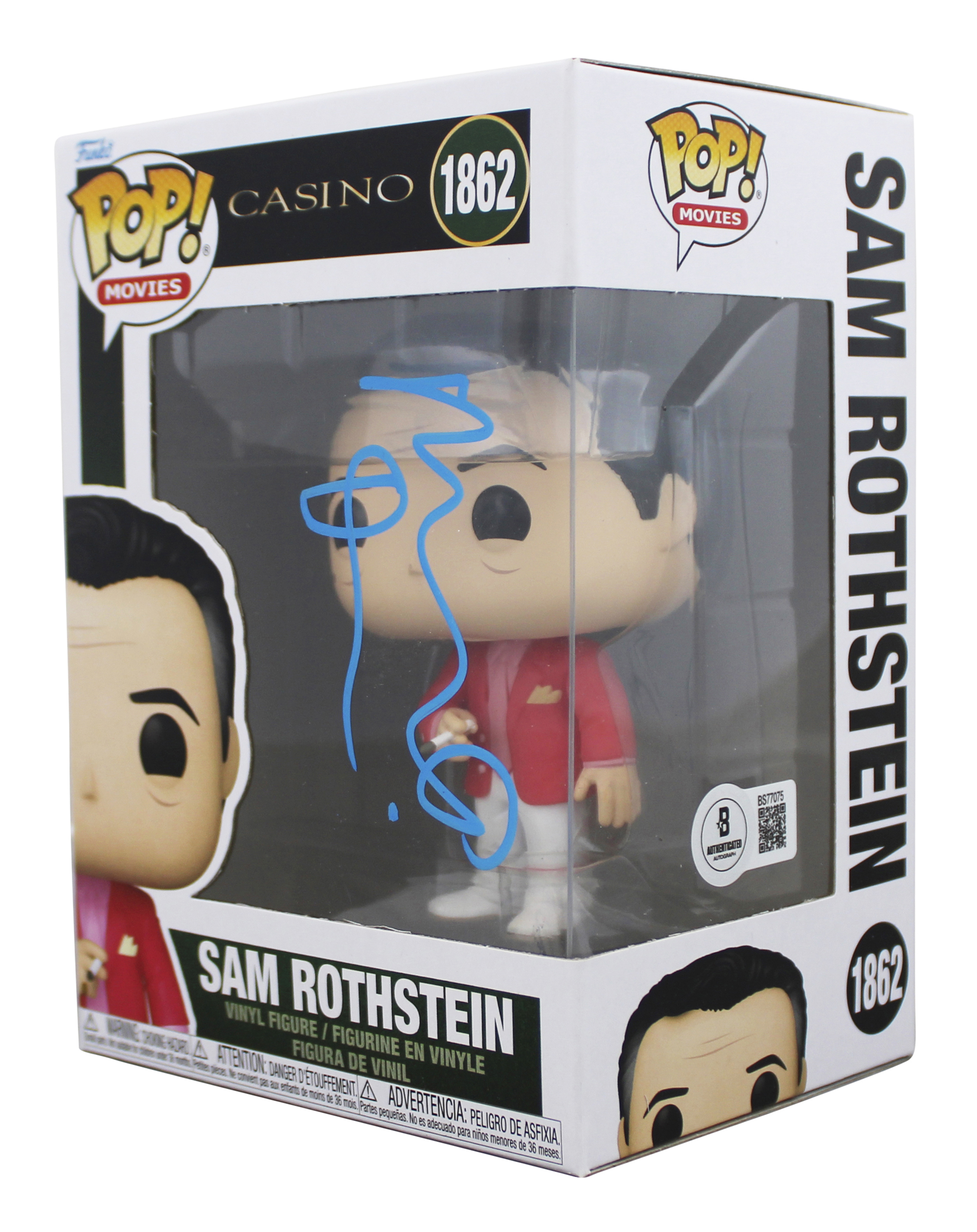 This Autographed Sam Rothstein #1862 Funko Pop Vinyl Figure has been Personally Signed by Robert DeNiro of Casino. This item is 100% Authentic to include a hologram by Beckett Authentication Services. This item will come with an affixed Beckett Authentication Services (BAS) authentication sticker, which includes a scannable QR code to verify authenticity. Please note that Beckett no longer provides serial-numbered COA cards, and the attached BAS sticker will serve as the complete authentication for this item. The authenticity can be verified on Beckett Authentication Services website. This item will ship in a Pop! Protector, please refer to the photos for condition of the item prior to purchase, these are in good condition but would not be considered mint.