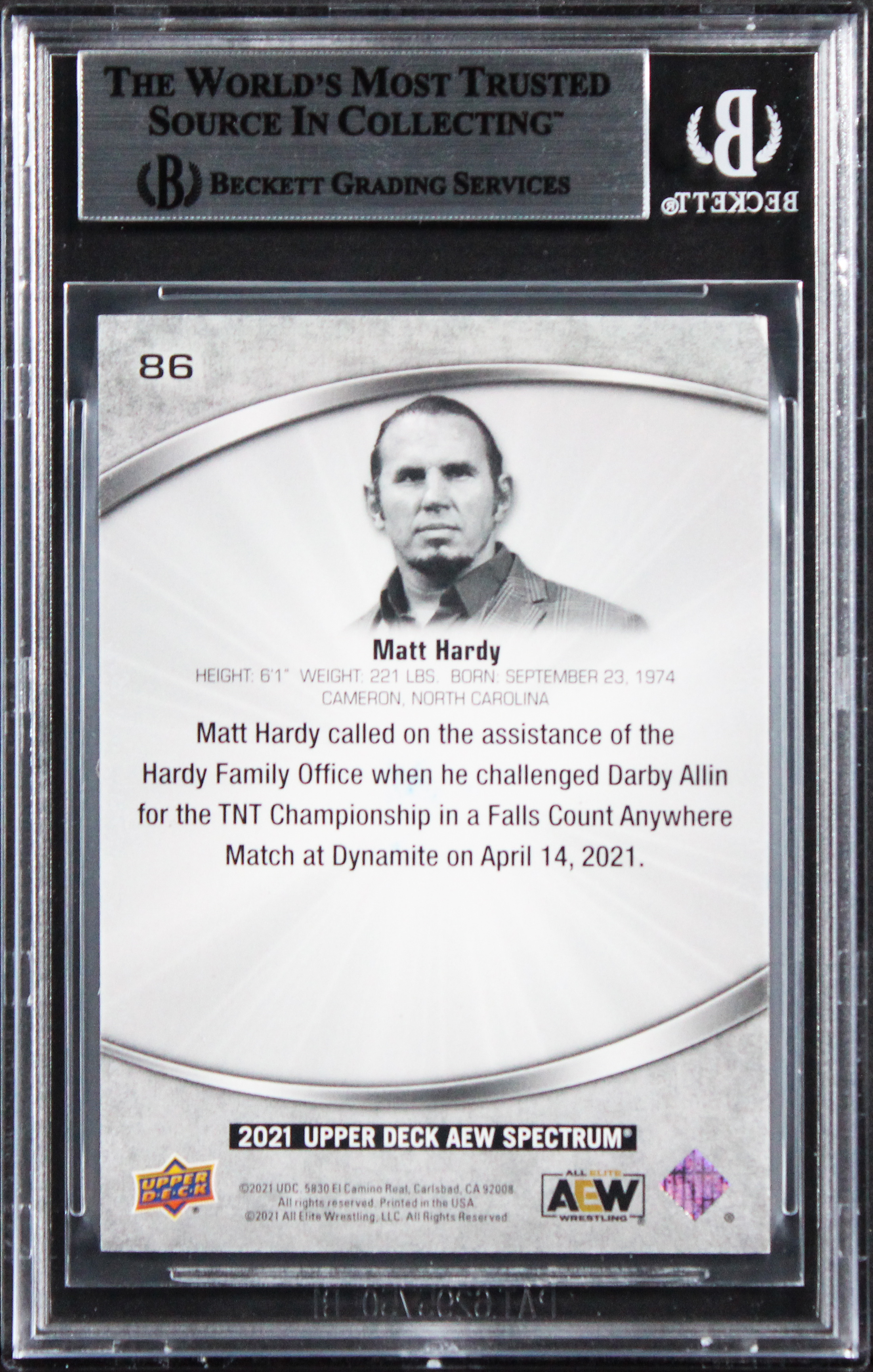 This Autographed 2021 Upper Deck AEW Spectrum #86 Card has been Personally Signed by Matt Hardy of the World Wrestling Entertainment. This item is 100% Authentic, it comes slabbed and authenticated by Beckett Authentication Services. The authenticity can be verified on Beckett Authentication Services website.