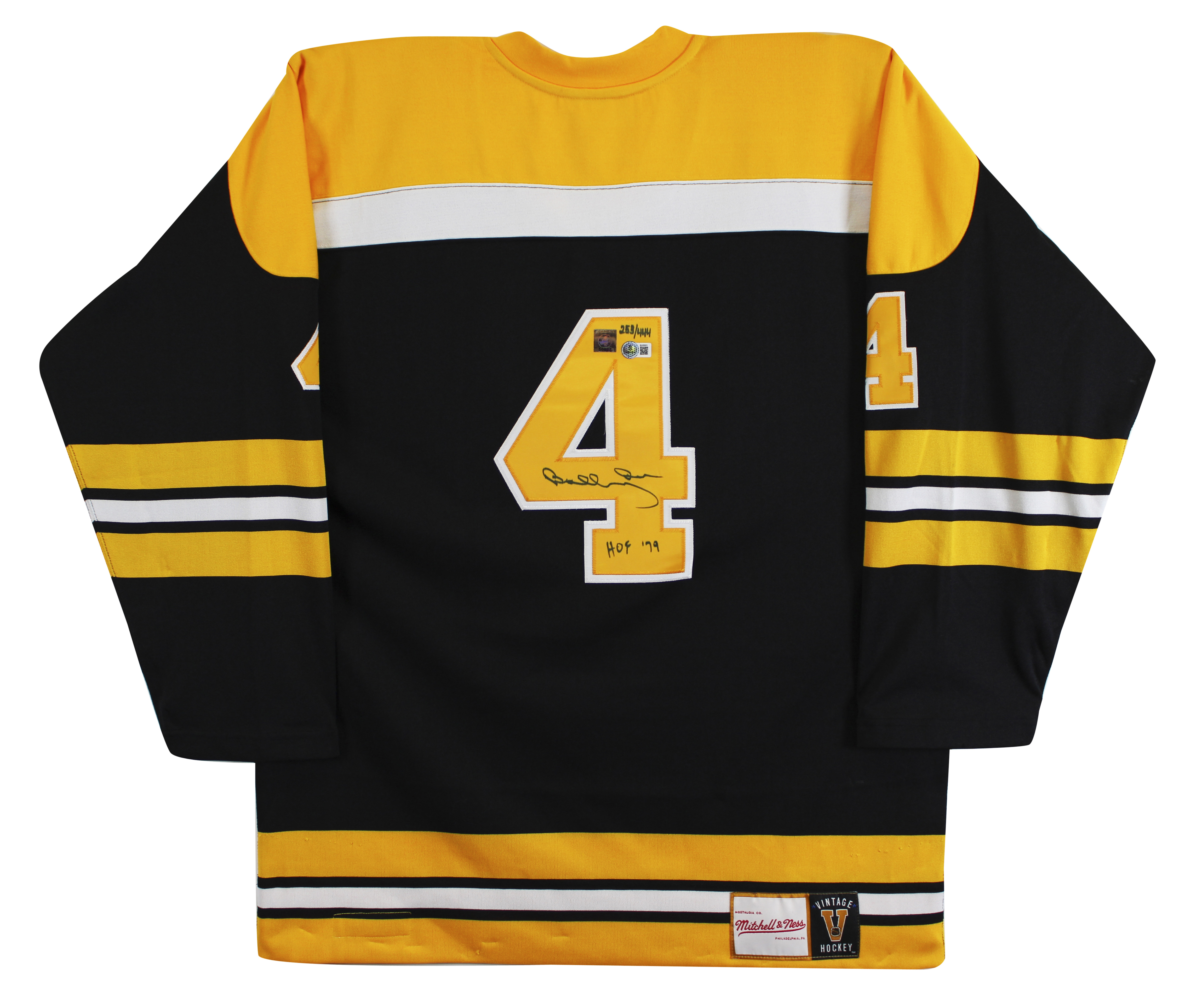 This Autographed Black Vintage Mitchell & Ness Throwback Jersey with the inscription of "HOF 79" has been Personally Signed by Bobby Orr of the Boston Bruins. This item is 100% Authentic to include a hologram by Beckett Authentication Services. This item will come with an affixed Beckett Authentication Services (BAS) authentication sticker, which includes a scannable QR code to verify authenticity. Please note that Beckett no longer provides serial-numbered COA cards, and the attached BAS sticker will serve as the complete authentication for this item. The authenticity can be verified on Beckett Authentication Services website. This is a X-Large sized Jersey. This jersey is also authenticated by Great North Road, and it will come with its GNR matching COA card.