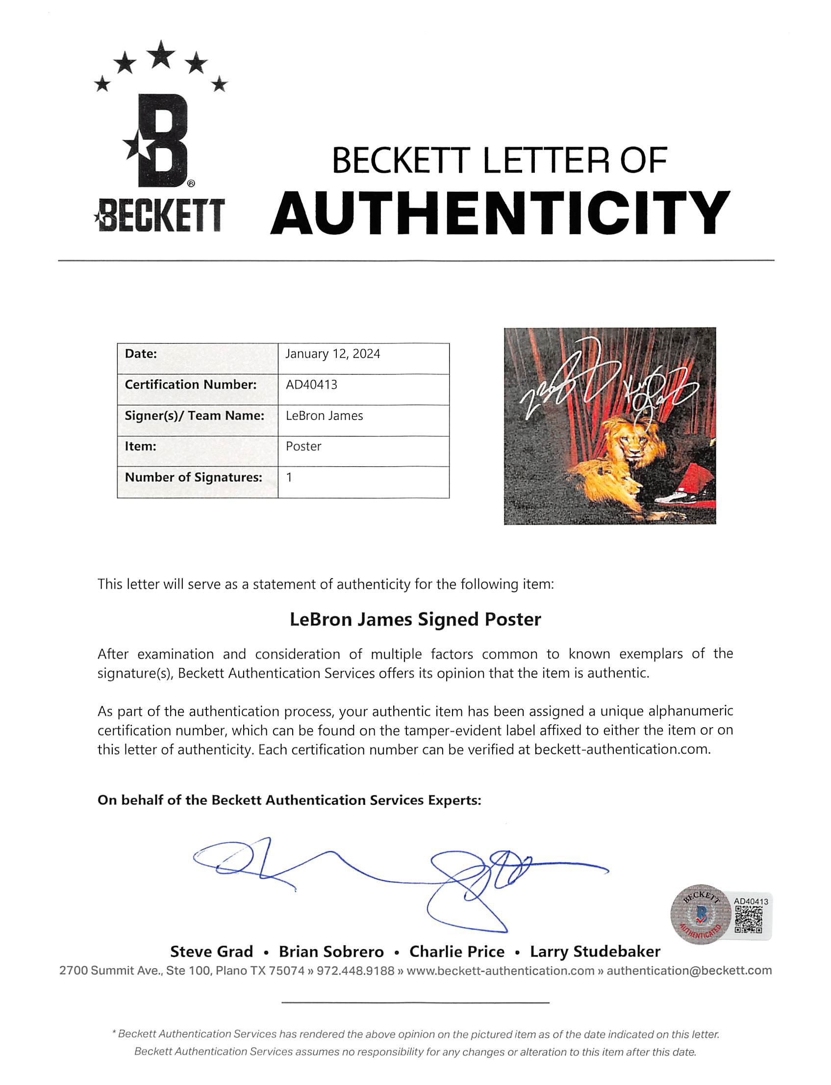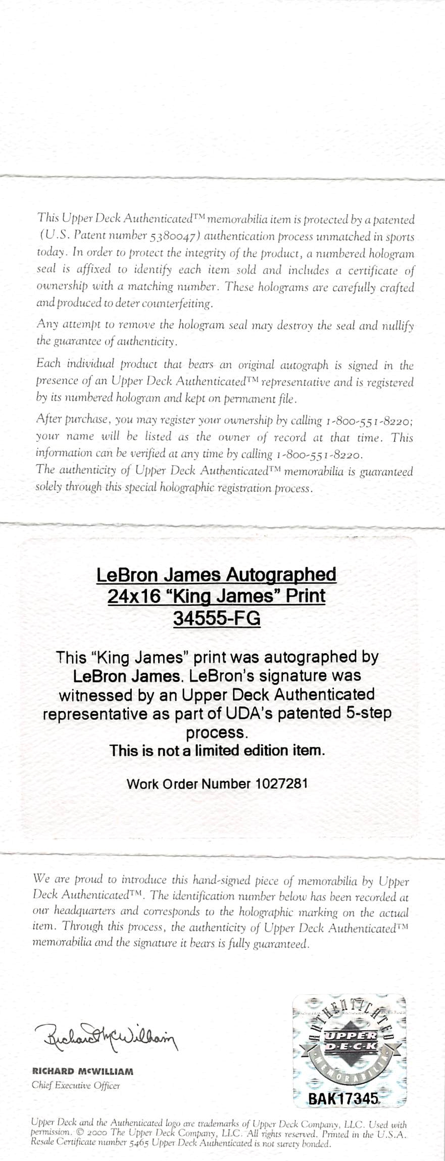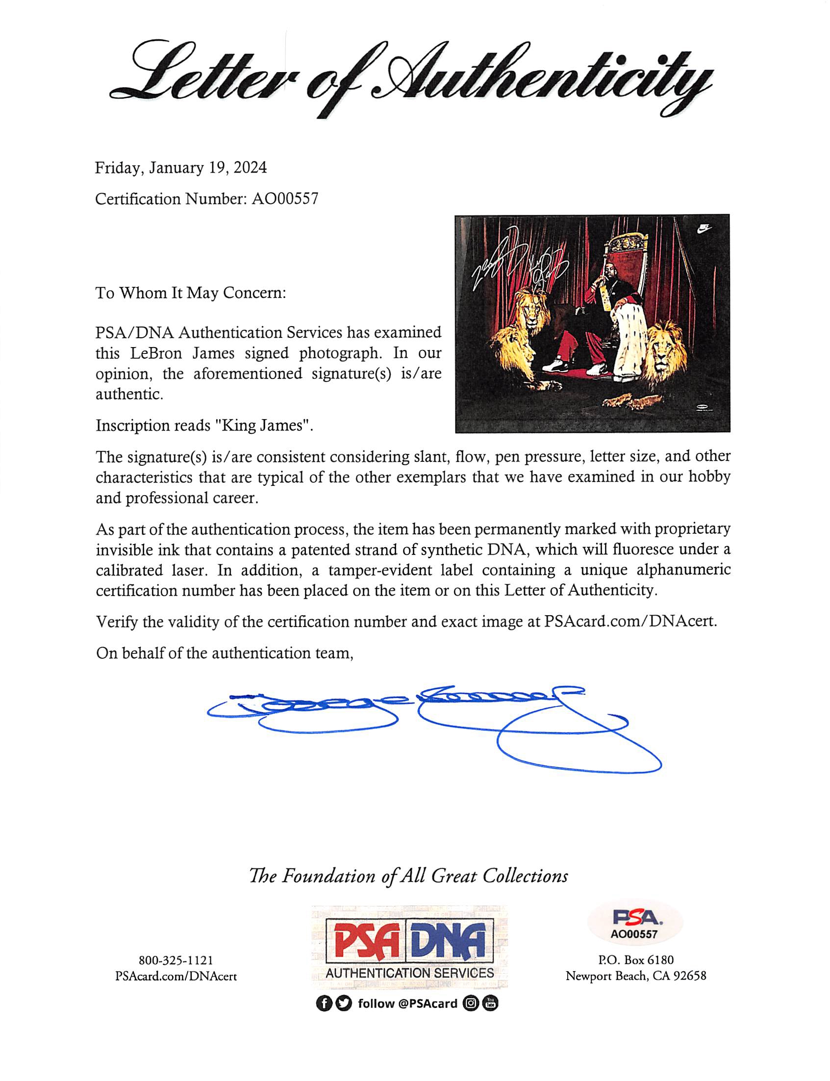 This Autographed 16x24 King James Framed Photo with the inscription of "King James" has been Personally Signed by LeBron James of the Cleveland Cavaliers. This item is 100% Authentic to include a Certificate of Authenticity (COA) / hologram by UDA. The authenticity can be verified on Upper Deck Authentic website. This item has been professionally framed to overall dimensions of approximately 21.25 x 29.25 inches.