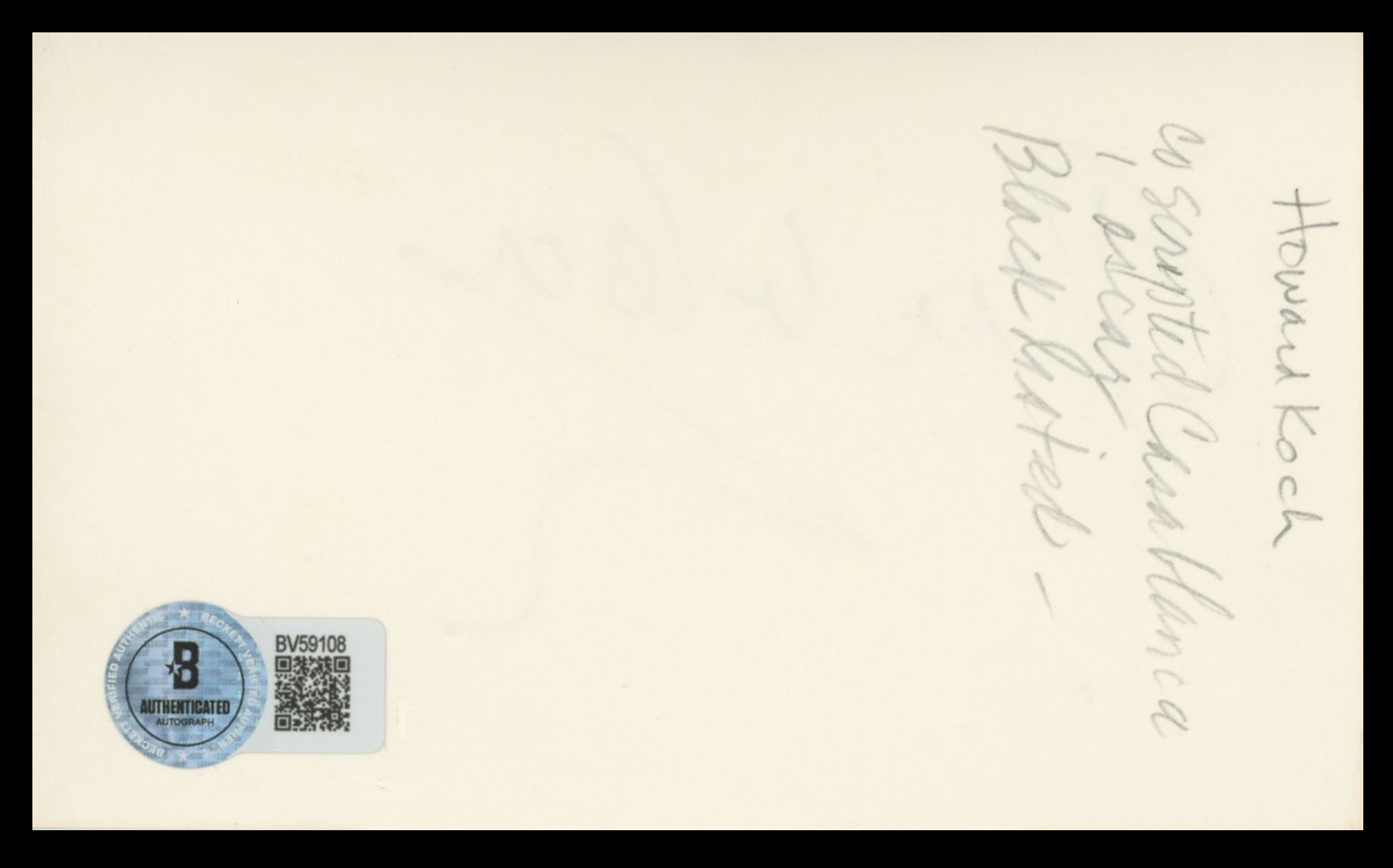 This Autographed 3x5 Index Card has been Personally Signed by Howard Koch. This item is 100% Authentic to include a hologram by Beckett Authentication Services. This item will come with an affixed Beckett Authentication Services (BAS) authentication sticker, which includes a scannable QR code to verify authenticity. Please note that Beckett no longer provides serial-numbered COA cards, and the attached BAS sticker will serve as the complete authentication for this item. The authenticity can be verified on Beckett Authentication Services website.