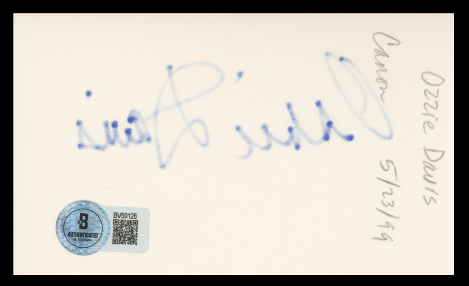 This Autographed 3x5 Index Card has been Personally Signed by Ossie Davis of Do the Right Thing. This item is 100% Authentic to include a hologram by Beckett Authentication Services. This item will come with an affixed Beckett Authentication Services (BAS) authentication sticker, which includes a scannable QR code to verify authenticity. Please note that Beckett no longer provides serial-numbered COA cards, and the attached BAS sticker will serve as the complete authentication for this item. The authenticity can be verified on Beckett Authentication Services website.