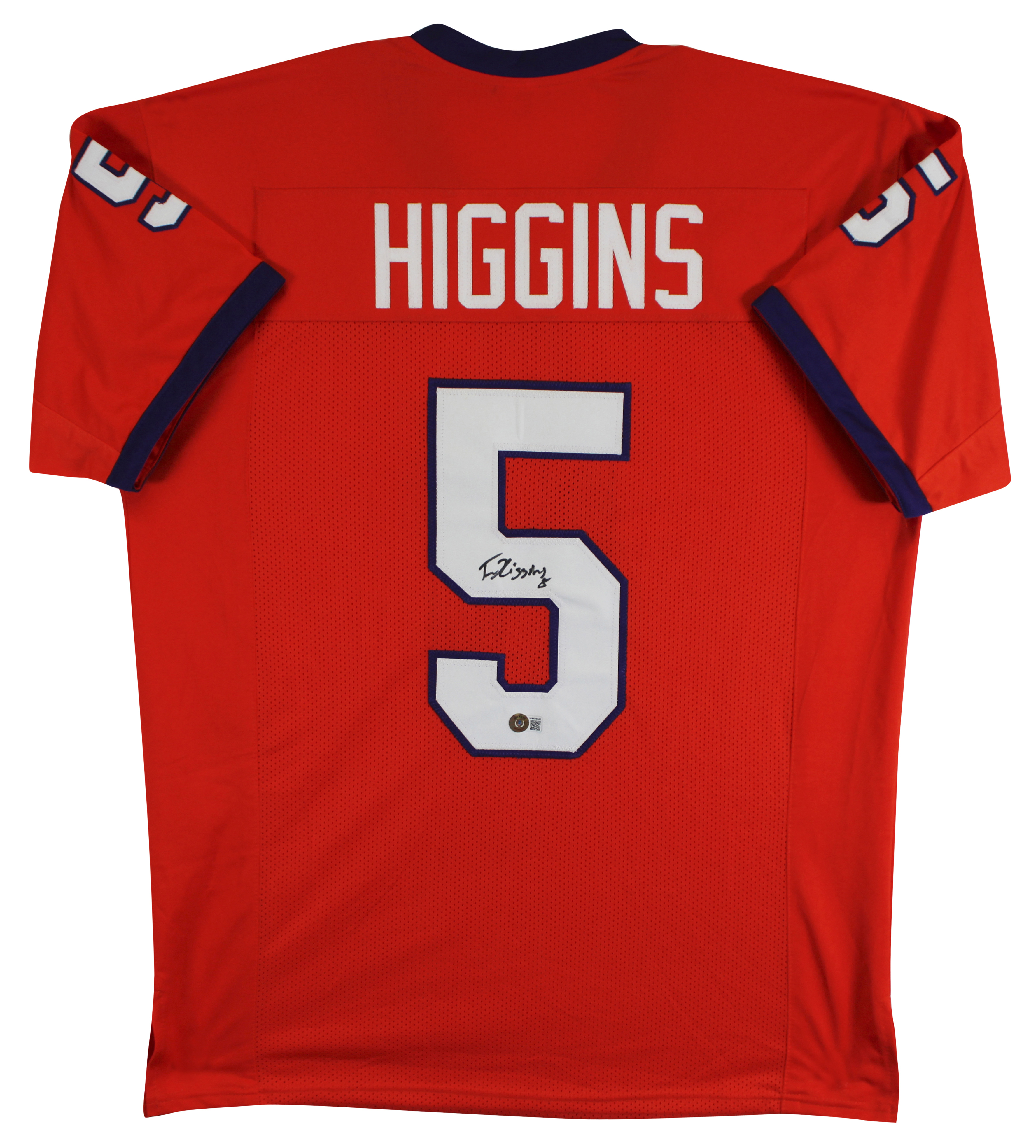 This Autographed Orange Pro Style Jersey has been Personally Signed by Tee Higgins of the Clemson Tigers. This item is 100% Authentic to include a hologram by Beckett Authentication Services. This item will come with an affixed Beckett Authentication Services (BAS) authentication sticker, which includes a scannable QR code to verify authenticity. Please note that Beckett no longer provides serial-numbered COA cards, and the attached BAS sticker will serve as the complete authentication for this item. This is a BAS Witnessed Protection Program item which means a Beckett Authentication Service representative was present when this item was being signed. The authenticity can be verified on Beckett Authentication Services website. This is a X-Large sized, non-branded, custom-stitched Jersey.