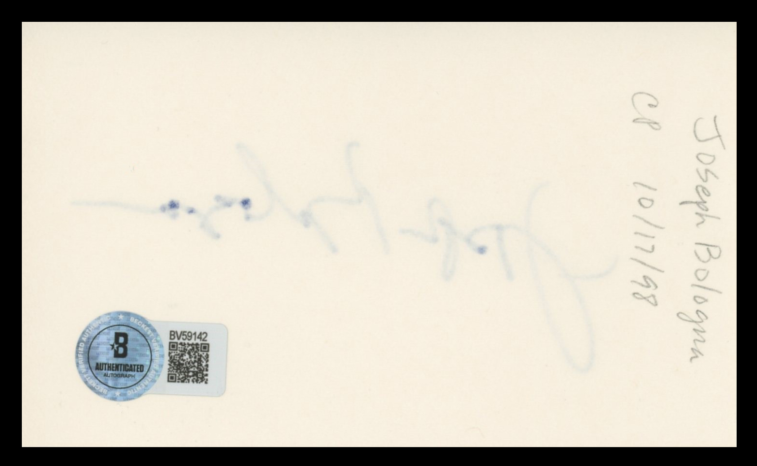 This Autographed 3x5 Index Card has been Personally Signed by Joseph Bologna of My Favorite Year. This item is 100% Authentic to include a hologram by Beckett Authentication Services. This item will come with an affixed Beckett Authentication Services (BAS) authentication sticker, which includes a scannable QR code to verify authenticity. Please note that Beckett no longer provides serial-numbered COA cards, and the attached BAS sticker will serve as the complete authentication for this item. The authenticity can be verified on Beckett Authentication Services website.