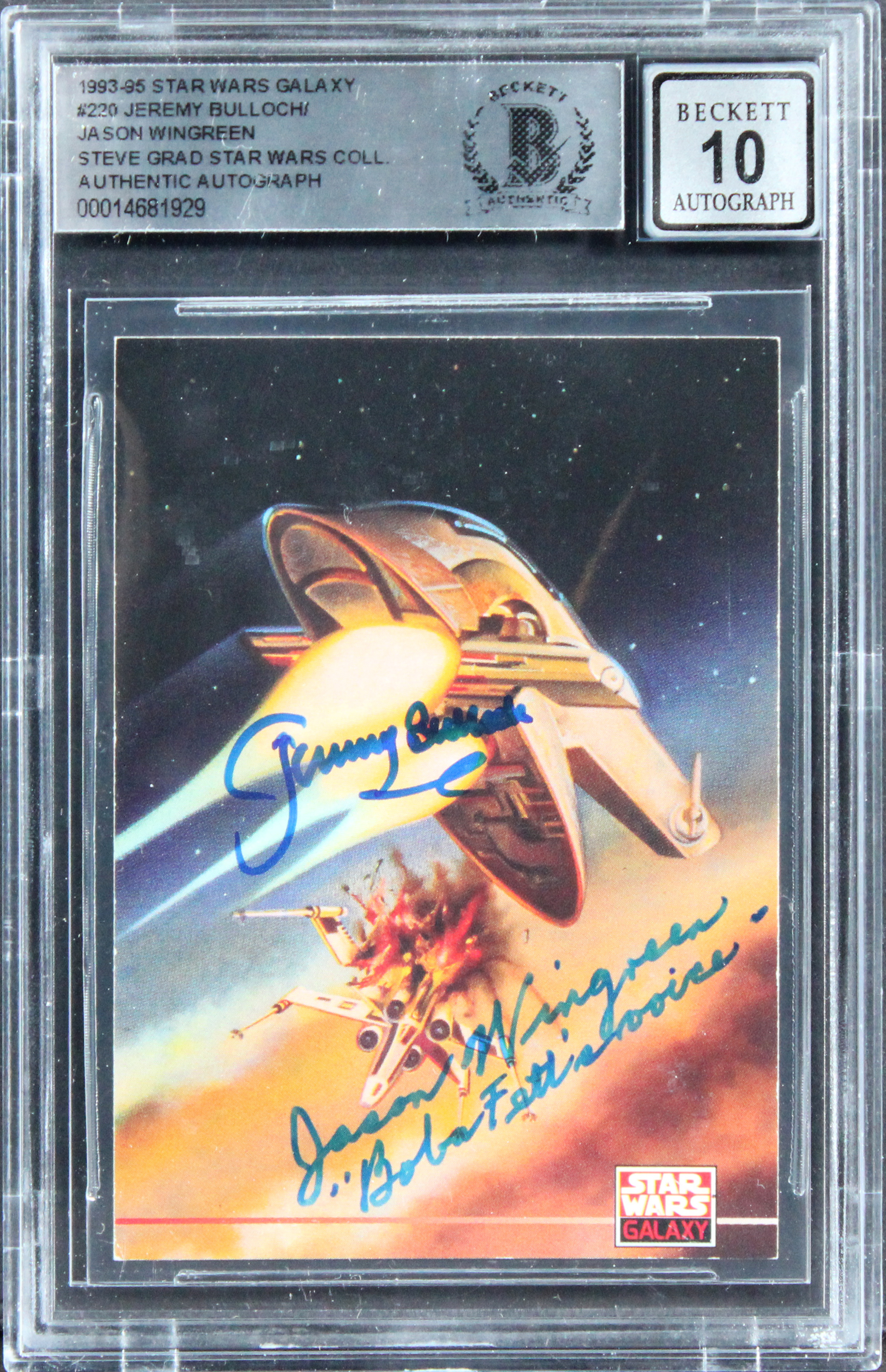 This Autographed Auto Grade Gem Mint 10! Card with the inscription of "Boba Fett's voice" has been Personally Signed by Jeremy Bulloch & Jason Wingreen of Star Wars. This item is 100% Authentic, it comes slabbed and authenticated by Beckett Authentication Services. The authenticity can be verified on Beckett Authentication Services website.
