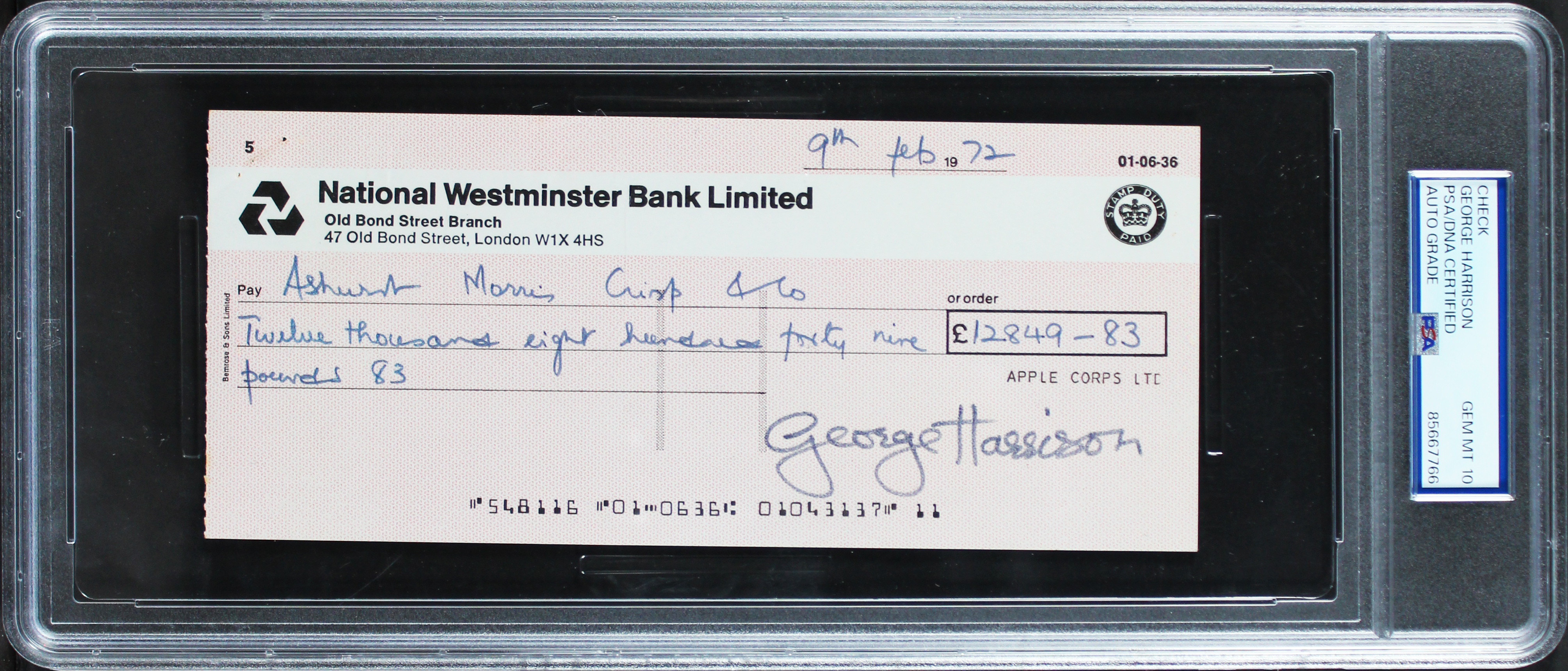 This Autographed Dated February 9, 1972 Auto Graded Gem Mint 10! 3.5x8 Apple Corporation National Westminster Bank Limited Check has been Personally Signed by George Harrison of The Beatles. This item is 100% Authentic, it comes slabbed and authenticated by PSA/DNA. The authenticity can be verified on Professional Sports Authenticator website.