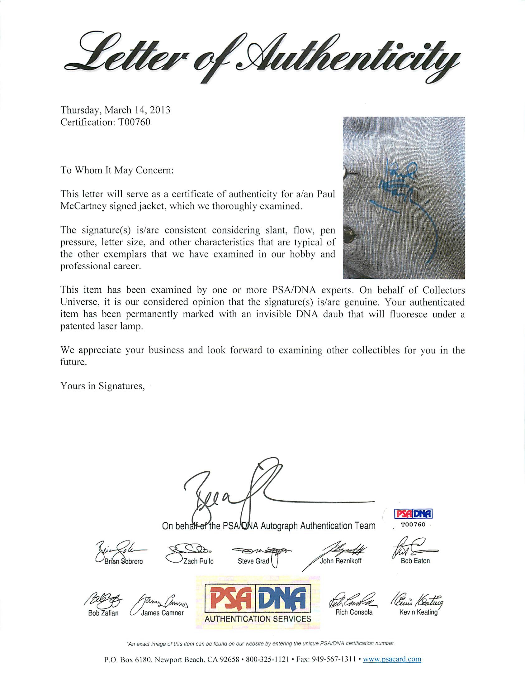 This is a Replica Dezo Hoffman Jacket Authentic Signed that has been Personally Signed & Autographed by Paul McCartney. This is the style jacket that The Bealtes wore during the famous Dezo Hoffman photoshoots. This item is 100% Authentic to include a Certificate of Authenticity (COA) / hologram by PSA/DNA #T00760.Press Pass Collectibles offers a 100% Lifetime Guarantee on all Autographed & Signed Paul McCartney memorabilia.