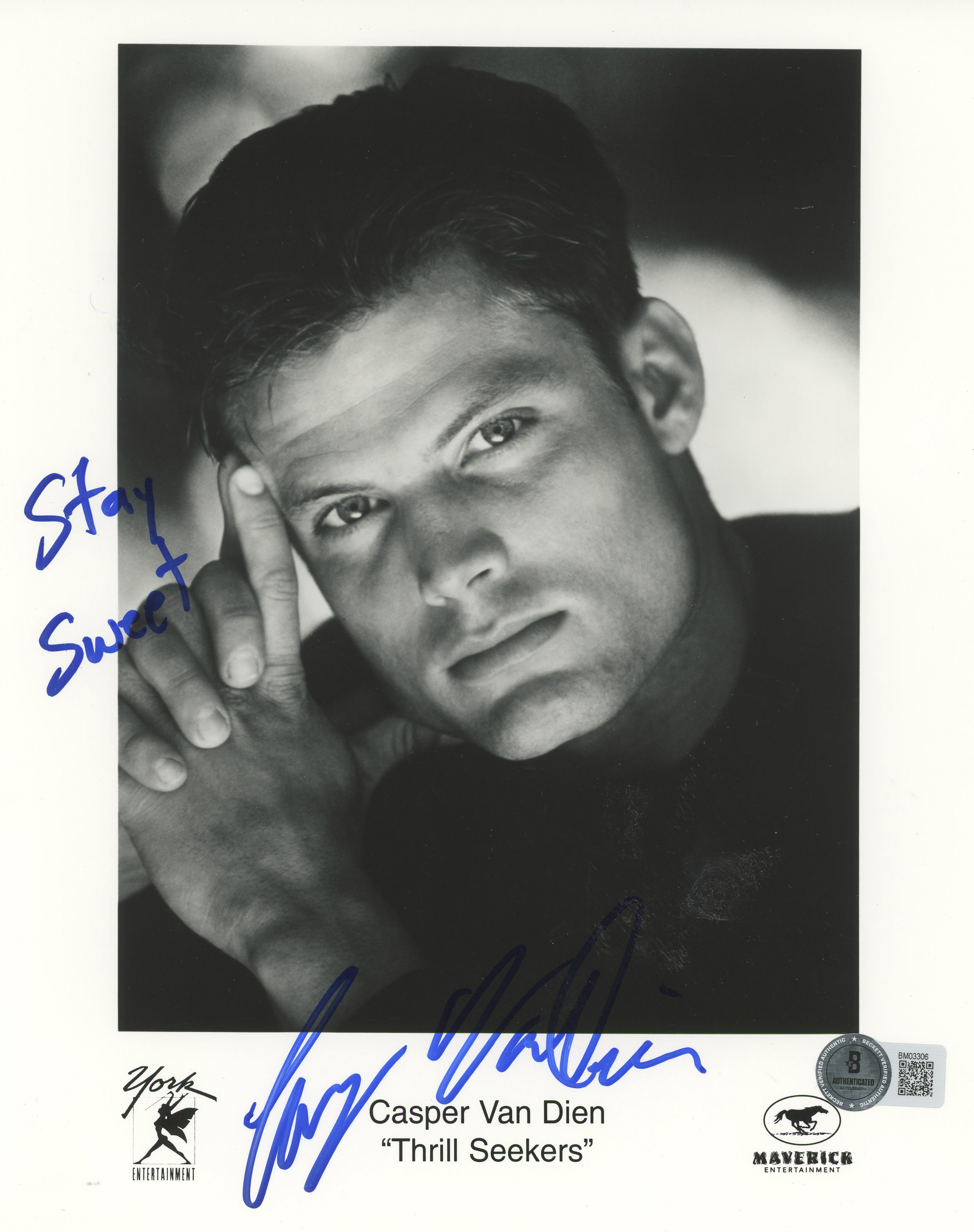 This Autographed 8x10 Photo with the inscription of "Stay Sweet" has been Personally Signed by Casper Van Dien of Thrill Seekers. This item is 100% Authentic to include a hologram by Beckett Authentication Services. This item will come with an affixed Beckett Authentication Services (BAS) authentication sticker, which includes a scannable QR code to verify authenticity. Please note that Beckett no longer provides serial-numbered COA cards, and the attached BAS sticker will serve as the complete authentication for this item. The authenticity can be verified on Beckett Authentication Services website.