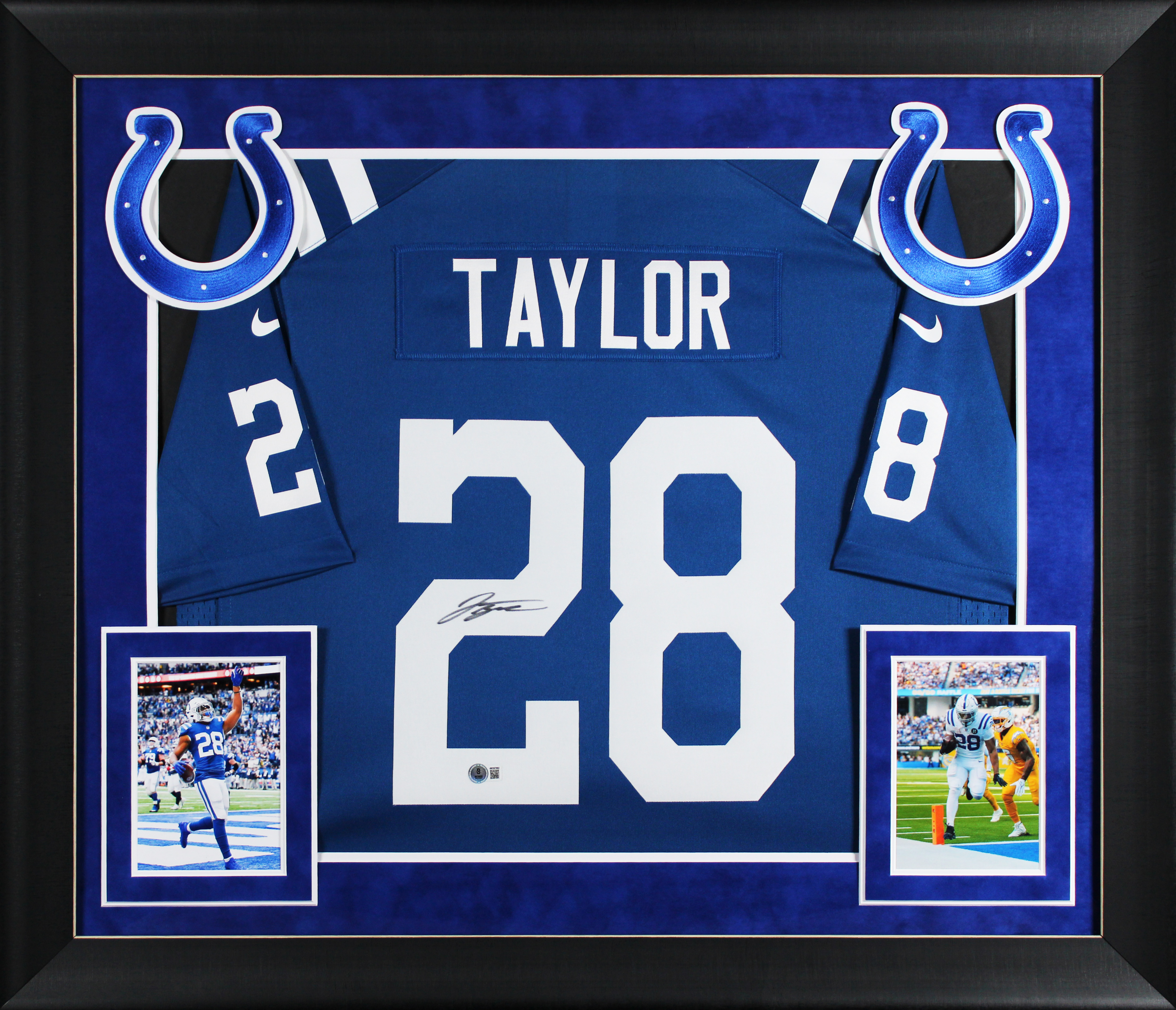 This Autographed Blue Nike Limited Framed Jersey has been Personally Signed by Jonathan Taylor of the Indianapolis Colts. This item is 100% Authentic to include a hologram by Beckett Authentication Services. This item will come with an affixed Beckett Authentication Services (BAS) authentication sticker, which includes a scannable QR code to verify authenticity. Please note that Beckett no longer provides serial-numbered COA cards, and the attached BAS sticker will serve as the complete authentication for this item. This is a BAS Witnessed Protection Program item which means a Beckett Authentication Service representative was present when this item was being signed. We conducted an autograph signing with Jonathan Taylor where multiples of the same item were signed. While the photographs are representative of this item, the size, placement and strength of the signature may vary. Each item is hand signed, therefore, each autograph is unique. This item can be verified through BAS Witnessed. This item has been professionally framed to overall dimensions of approximately 32 x 37 inches. This is a X-Large sized Framed Jersey. This jersey will be framed to order, it will take approximately 3-4 business days from purchase date for it to ship.