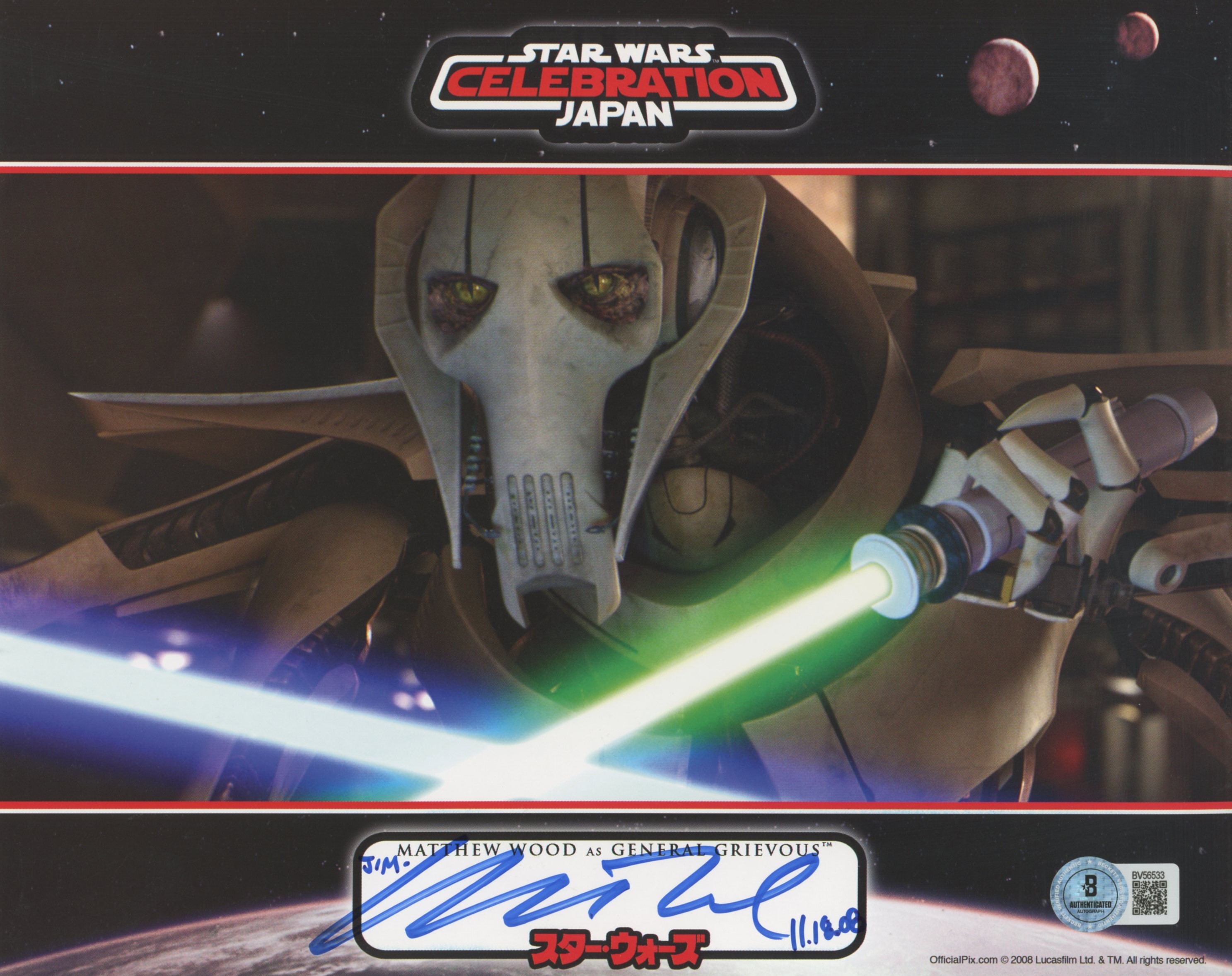 This Autographed 8x10 Photo with the inscription of "11.18.08" has been Personally Signed by Matthew Wood of Star Wars Episode III Revenge Of The Sith. This item is 100% Authentic to include a hologram by Beckett Authentication Services. This item will come with an affixed Beckett Authentication Services (BAS) authentication sticker, which includes a scannable QR code to verify authenticity. Please note that Beckett no longer provides serial-numbered COA cards, and the attached BAS sticker will serve as the complete authentication for this item. The authenticity can be verified on Beckett Authentication Services website.