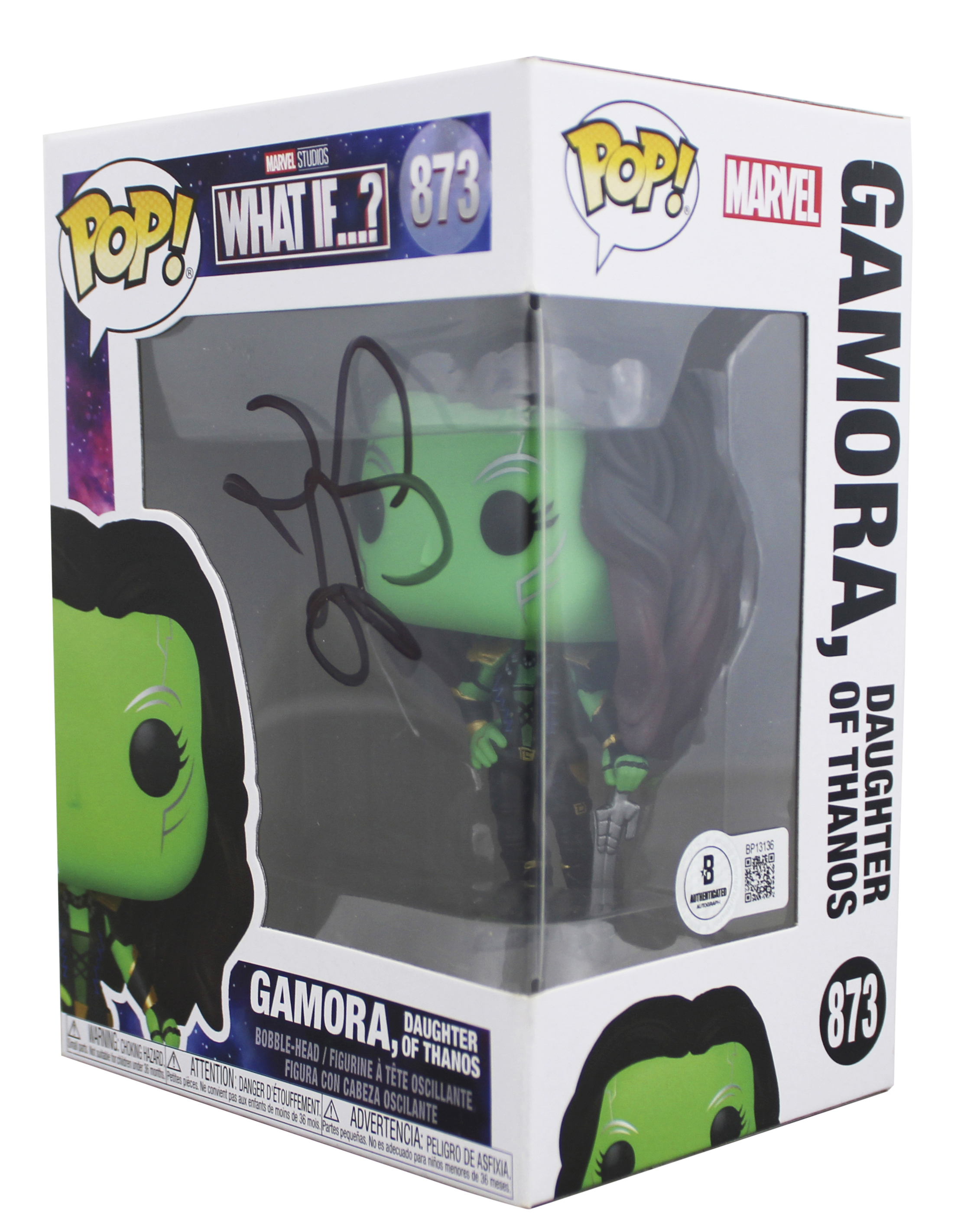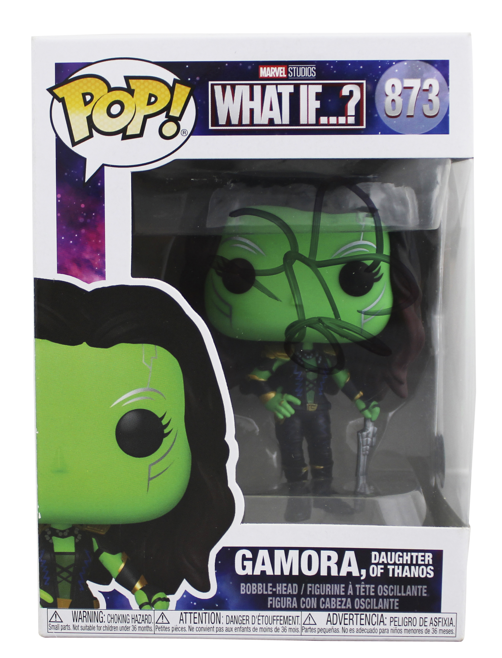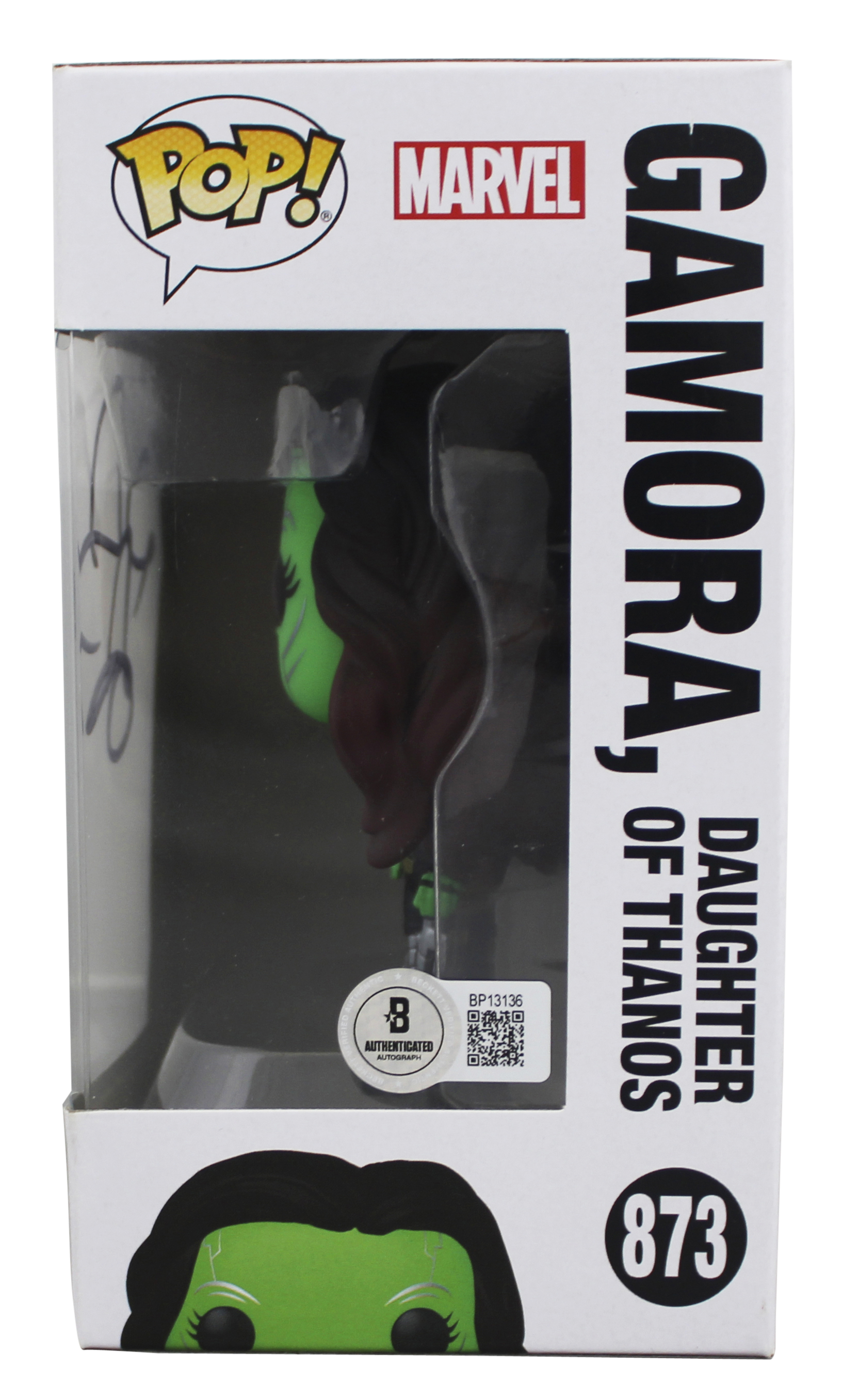 This Autographed Gamora, Daughter Of Thanos #873 Funko Pop Vinyl Figure has been Personally Signed by Zoe Saldana of Guardians of the Galaxy. This item is 100% Authentic to include a hologram by Beckett Authentication Services. This item will come with an affixed Beckett Authentication Services (BAS) authentication sticker, which includes a scannable QR code to verify authenticity. Please note that Beckett no longer provides serial-numbered COA cards, and the attached BAS sticker will serve as the complete authentication for this item. The authenticity can be verified on Beckett Authentication Services website. This will be shipped in a Pop Protector. This Funko will have some handling wear from shipment to the signing and back. Please refer to pictures for item's condition prior to purchase.