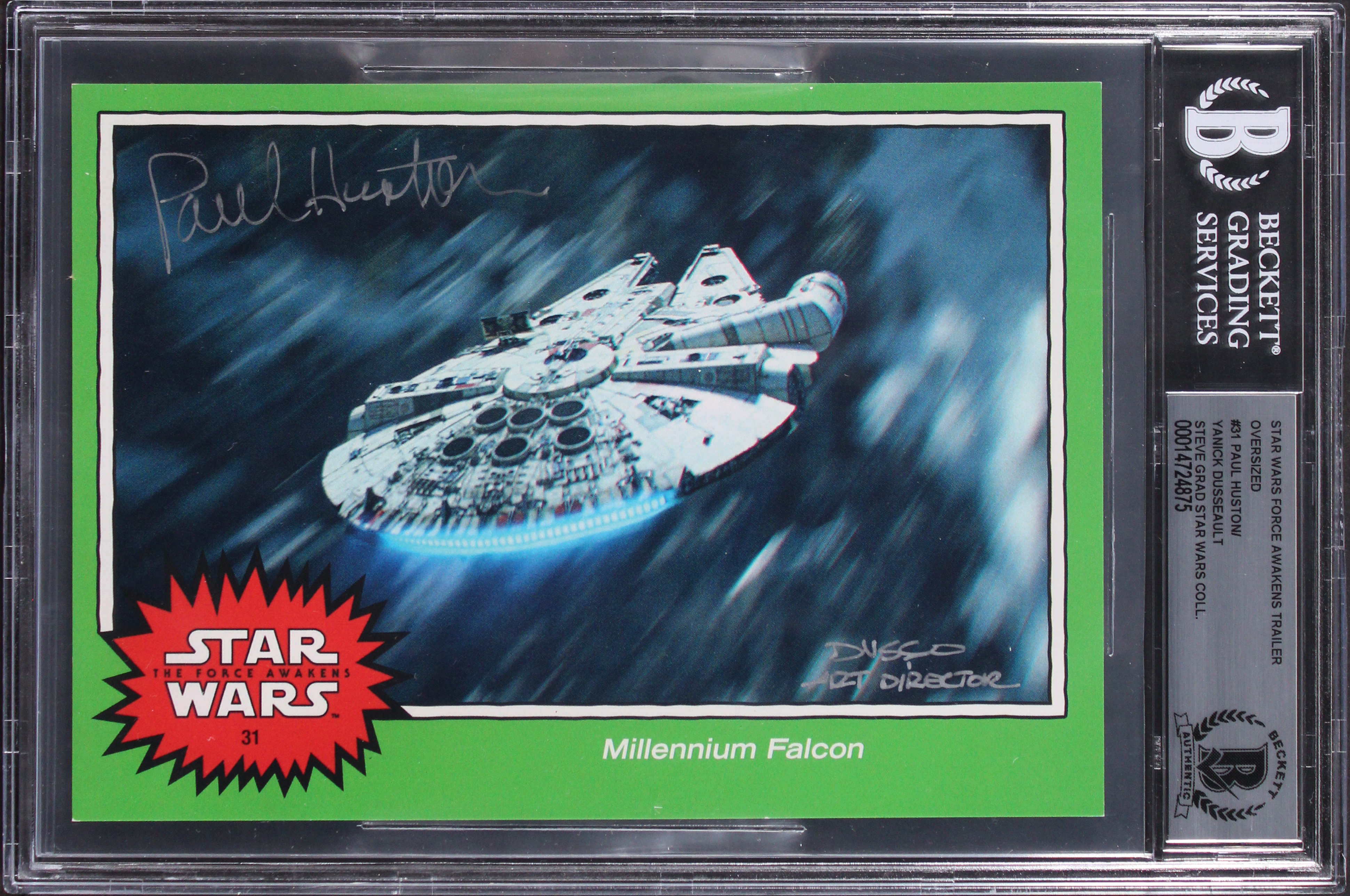 This Autographed 2015 Star Wars Force Awakens Trailer Oversized #31 Card with the inscription of "Art Director" has been Personally Signed by Paul Huston & Yanick Dusseault of Star Wars. This item is 100% Authentic, it comes slabbed and authenticated by Beckett Authentication Services. The authenticity can be verified on Beckett Authentication Services website.
