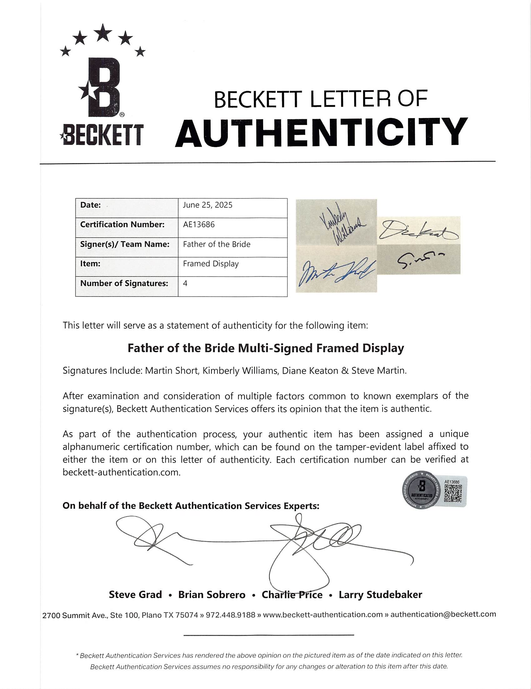 This Autographed Framed Display has been Personally Signed by Steve Martin, Martin Short, Kimberly Williams & Diane Keaton of Father of the Bride. This item is 100% Authentic to include a Certificate of Authenticity (COA) / hologram by Beckett Authentication Services. The authenticity can be verified on Beckett Authentication Services website. This item has been professionally framed to overall dimensions of approximately 28.5 x 30.5 inches.
