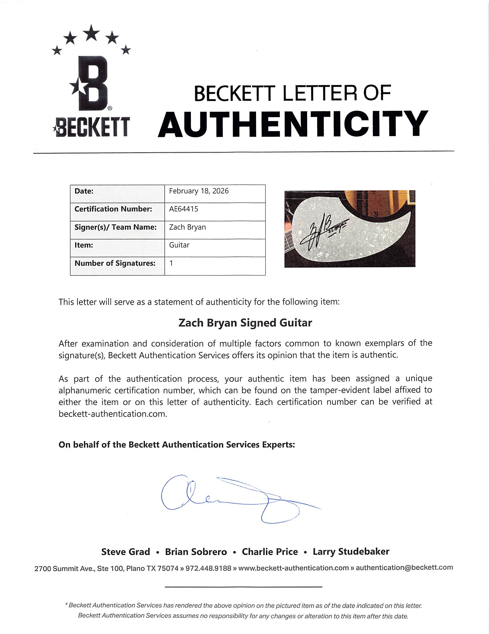 This Autographed Custom Acoustic Guitar has been Personally Signed by Zach Bryan. This item is 100% Authentic to include a Certificate of Authenticity (COA) / hologram by Beckett Authentication Services. The authenticity can be verified on Beckett Authentication Services website.