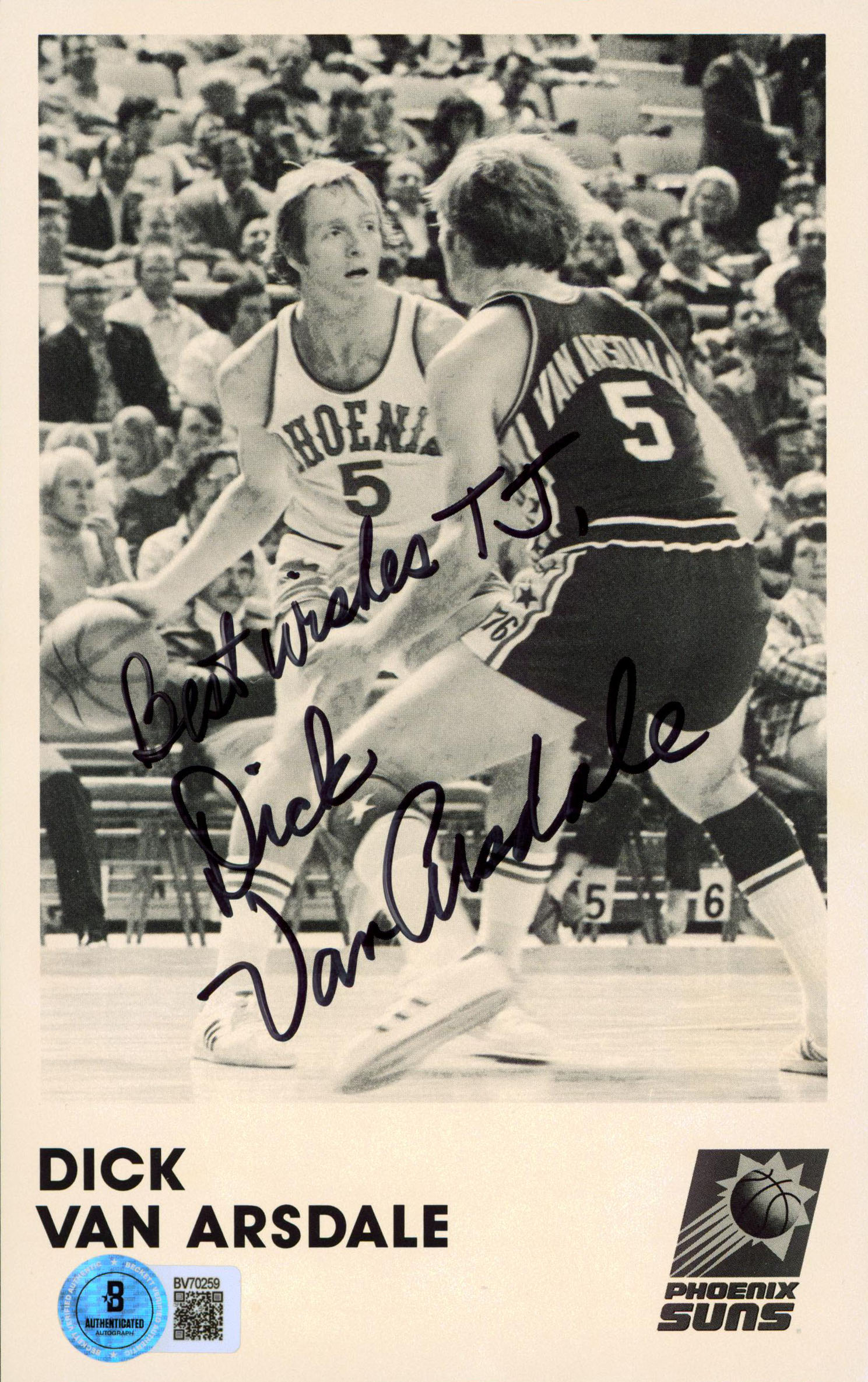 Suns Dick Van Arsdale "Best Wishes T.J." Authentic Signed Photo 5x8 BAS #BV70259
