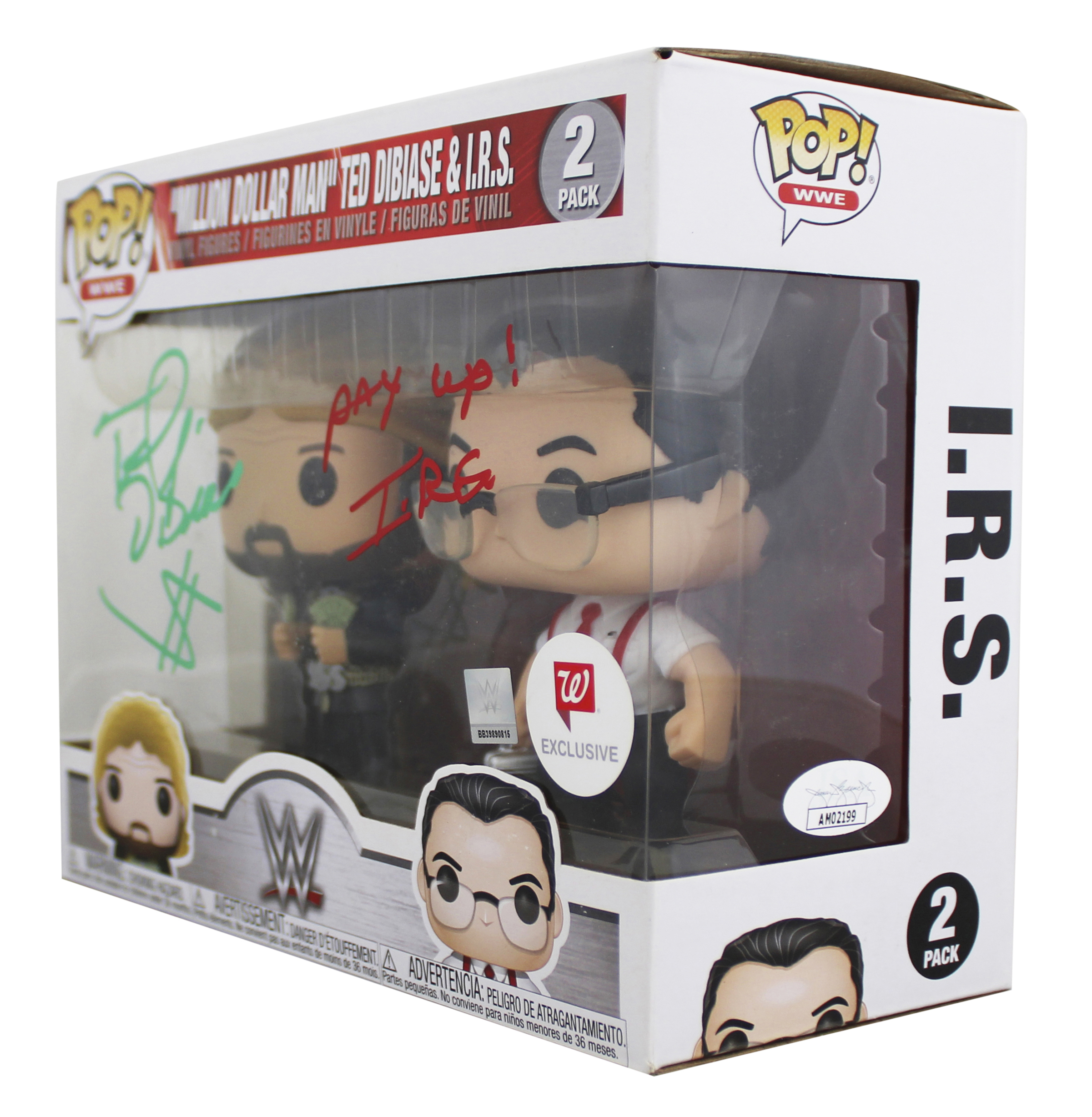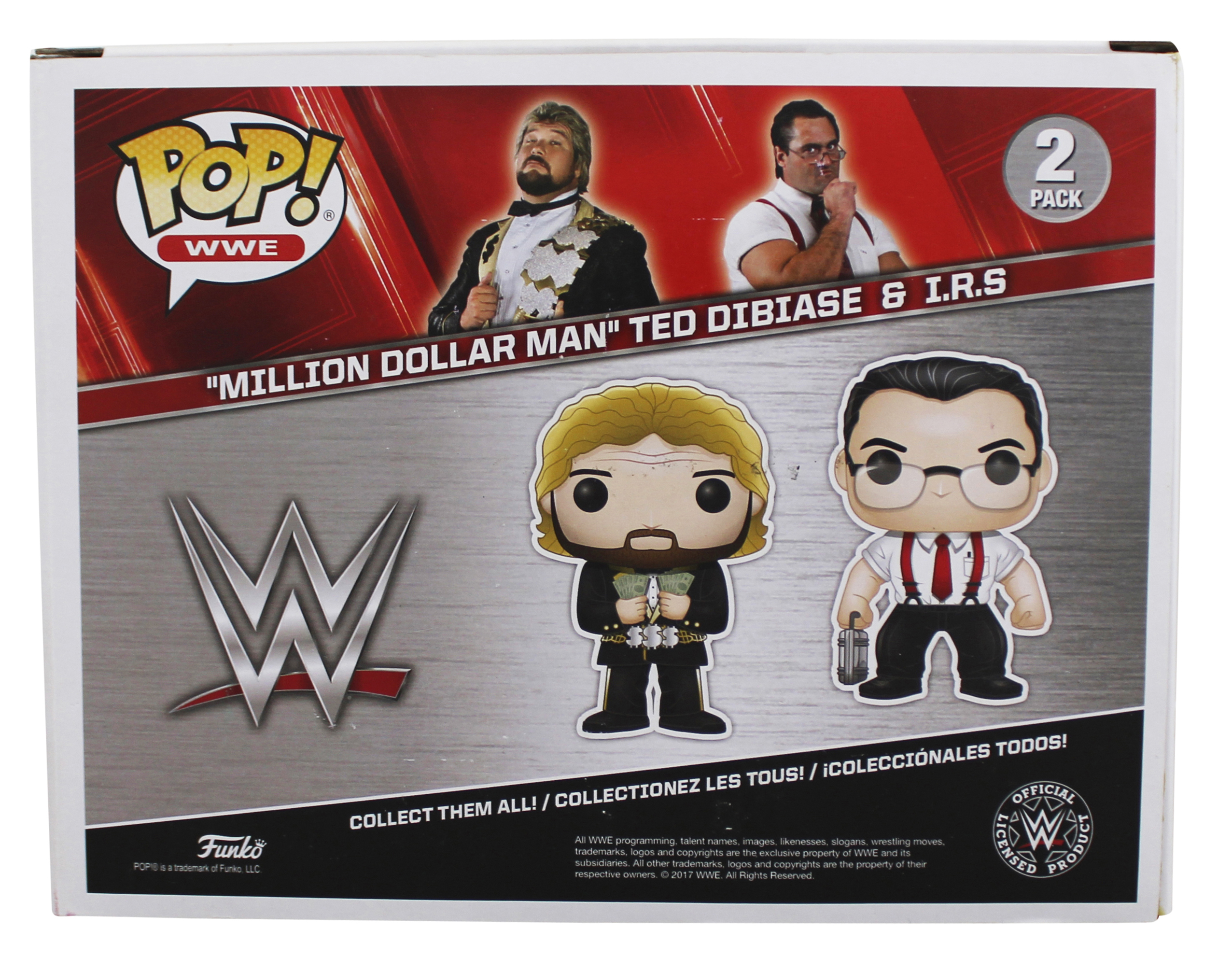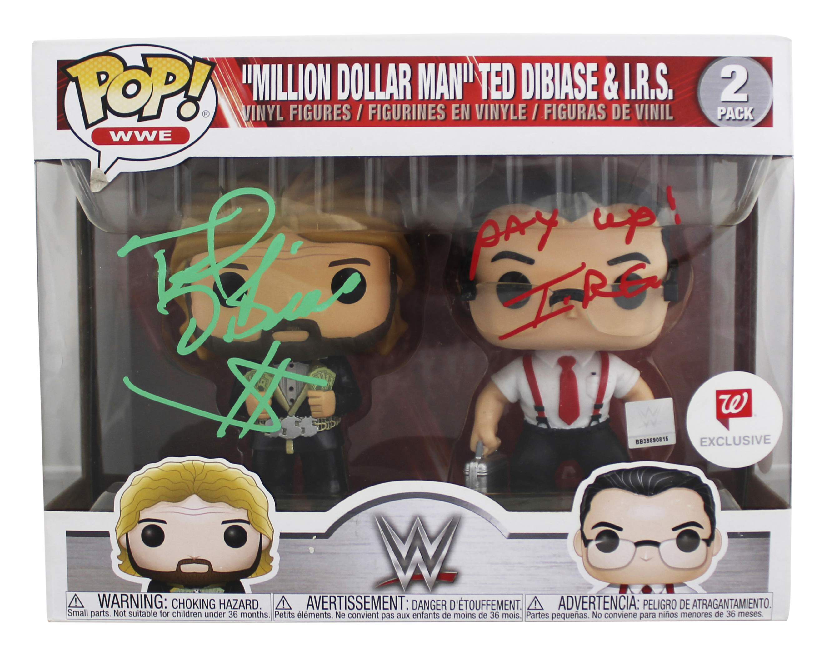 This Autographed 2 Pack Funko Pop Vinyl Figure with the inscription of "Pay Up! (I.R.S.)" has been Personally Signed by Ted Dibiase & I.R.S. of the World Wrestling Entertainment. This item is 100% Authentic to include a Certificate of Authenticity (COA) / hologram by JSA.The authenticity can be verified on JSA website. This Funko will not come with its matching JSA card, however, its authenticity can still be searched and verified in JSA's database.