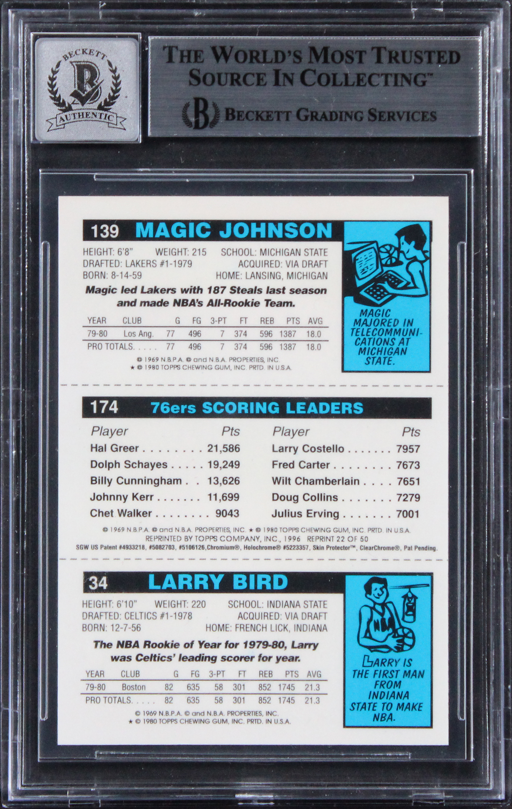 Bird, Erving, Magic Signed 1996 Topps Reprint #22 Card Auto 10 BAS Slab 2