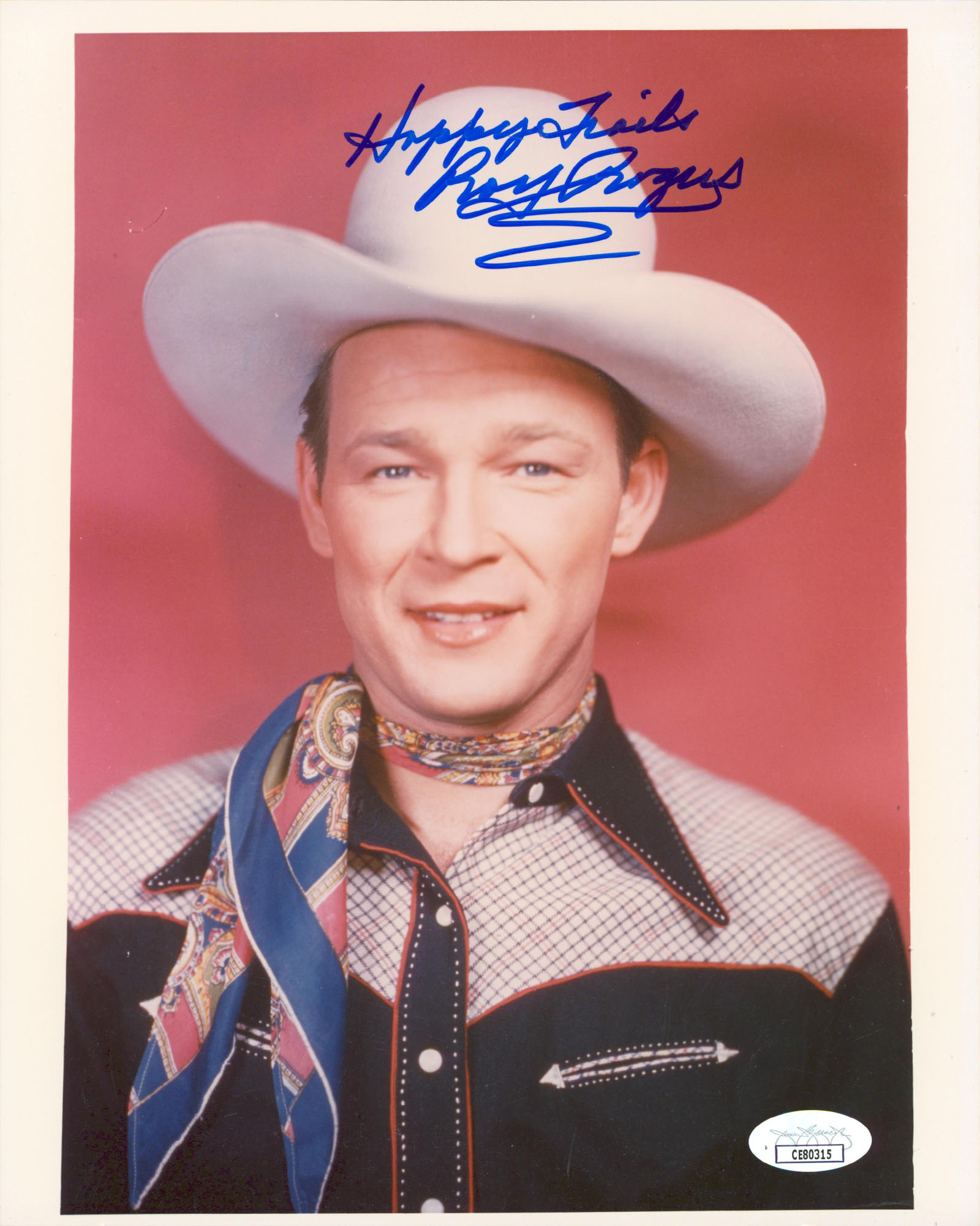 This Autographed Vertical 8x10 Photo with the inscription of "Happy Trails" has been Personally Signed by Roy Rogers of My Pal Trigger. This item is 100% Authentic to include a Certificate of Authenticity (COA) / hologram by JSA. The authenticity can be verified on JSA website.