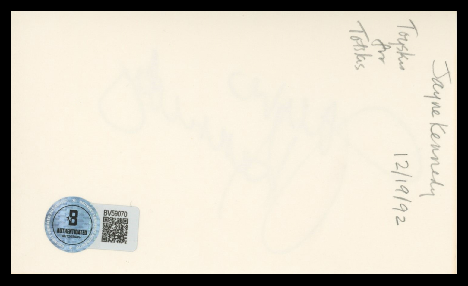 This Autographed 3x5 Index Card has been Personally Signed by Jayne Kennedy of Body and Soul. This item is 100% Authentic to include a hologram by Beckett Authentication Services. This item will come with an affixed Beckett Authentication Services (BAS) authentication sticker, which includes a scannable QR code to verify authenticity. Please note that Beckett no longer provides serial-numbered COA cards, and the attached BAS sticker will serve as the complete authentication for this item. The authenticity can be verified on Beckett Authentication Services website.