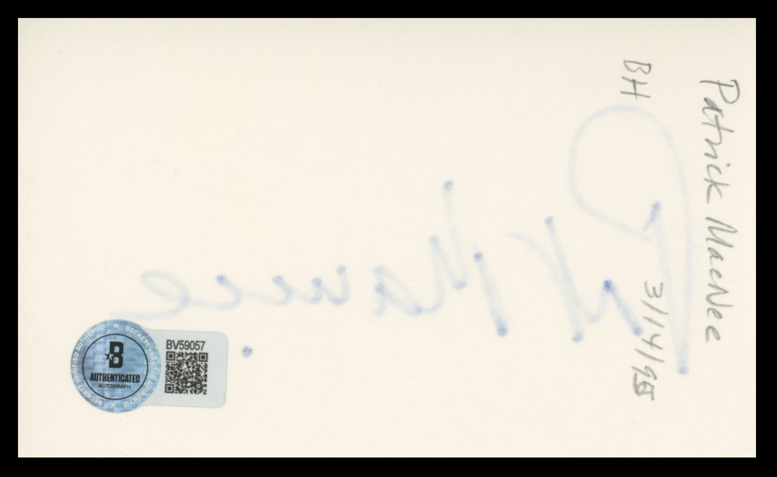 This Autographed 3x5 Index Card has been Personally Signed by Patrick Macnee of The Avengers. This item is 100% Authentic to include a hologram by Beckett Authentication Services. This item will come with an affixed Beckett Authentication Services (BAS) authentication sticker, which includes a scannable QR code to verify authenticity. Please note that Beckett no longer provides serial-numbered COA cards, and the attached BAS sticker will serve as the complete authentication for this item. The authenticity can be verified on Beckett Authentication Services website.